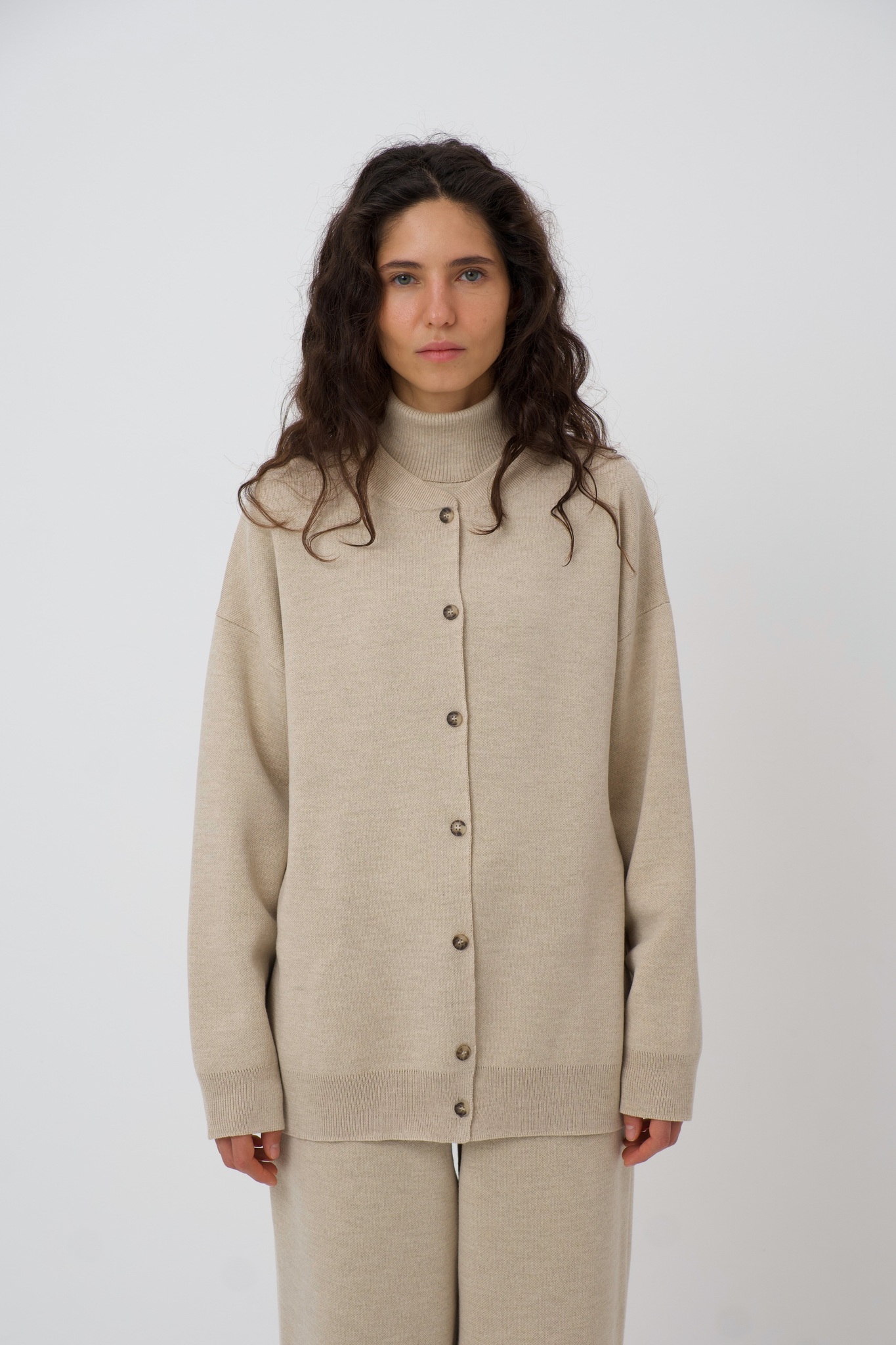 Смотрите параметры. Нет резинки по низу изделия, манжеты длиннее, горловина меньше. Бомбер Serena из мериноса extra fine 100%. Достаточно объёмный, на деликатных пуговицах. Пластичный, при этом держит форму. Комбинированная вязка даёт отличную плотность материалу, не добавляя тяжести, при этом изделие гораздо лучше ведёт себя в носке и менее подвержено растяжению и деформации. Нежнейший меринос extra fine 100%, шелковистый и совершенно не пилингуется. Обращаем внимание, что для вязанных изделий допустимы расхождения в указанных параметрах на 2-3 см.