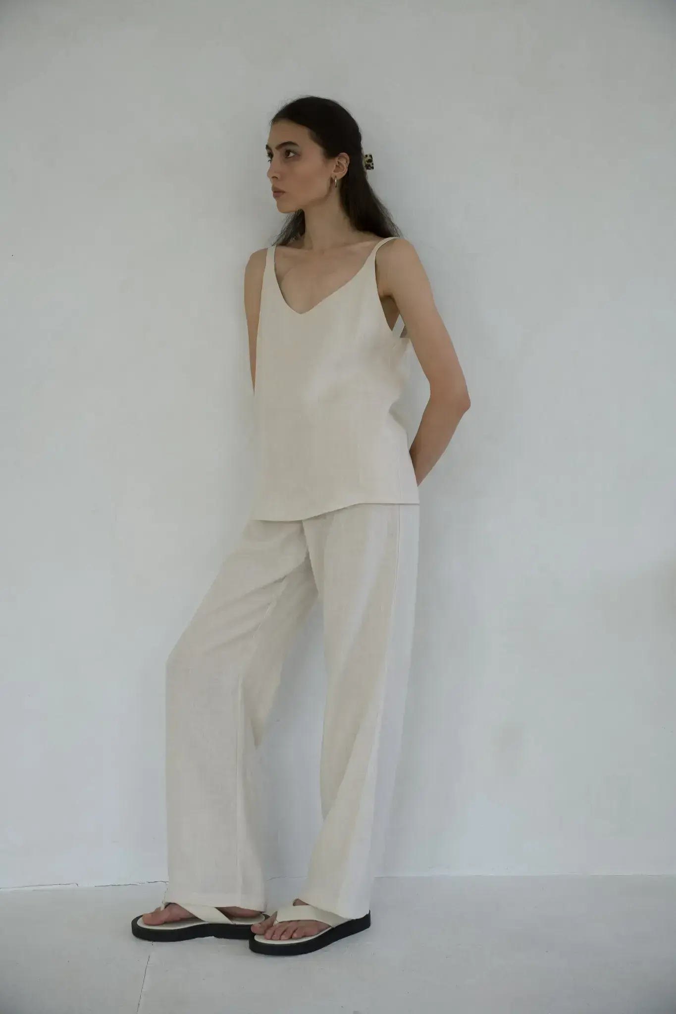 Домашние брюки изо льна 100%. На резинке, также на поясе есть завязки. По бокам карманы. В размерной сетке три размера: S, M и L. Свободный крой. Умягчённый лён приятен к коже и не вызывает раздражения, так как сам по себе не вызывает аллергии. Отлично подходят и для расслабленных образов на улицу.