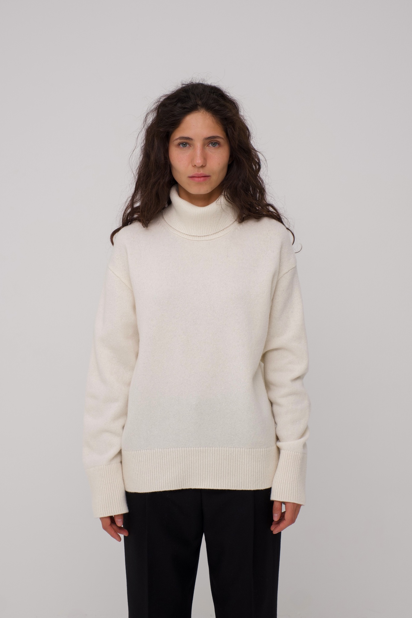 Джемпер из мериноса и кашемира. Спинка длиннее переда, ворот высокий. Средней плотности, невероятно нежный и мягкий. В этой модели доработаны лекала и посадка. Добавили декоративную дорожку по горловине. Пряжа имеет другие характеристики, что позволяет полотну быть более стабильным и износостойким. Обращаем внимание: для вязаных изделий допустимо расхождение от заявленных параметров на +-3 см.