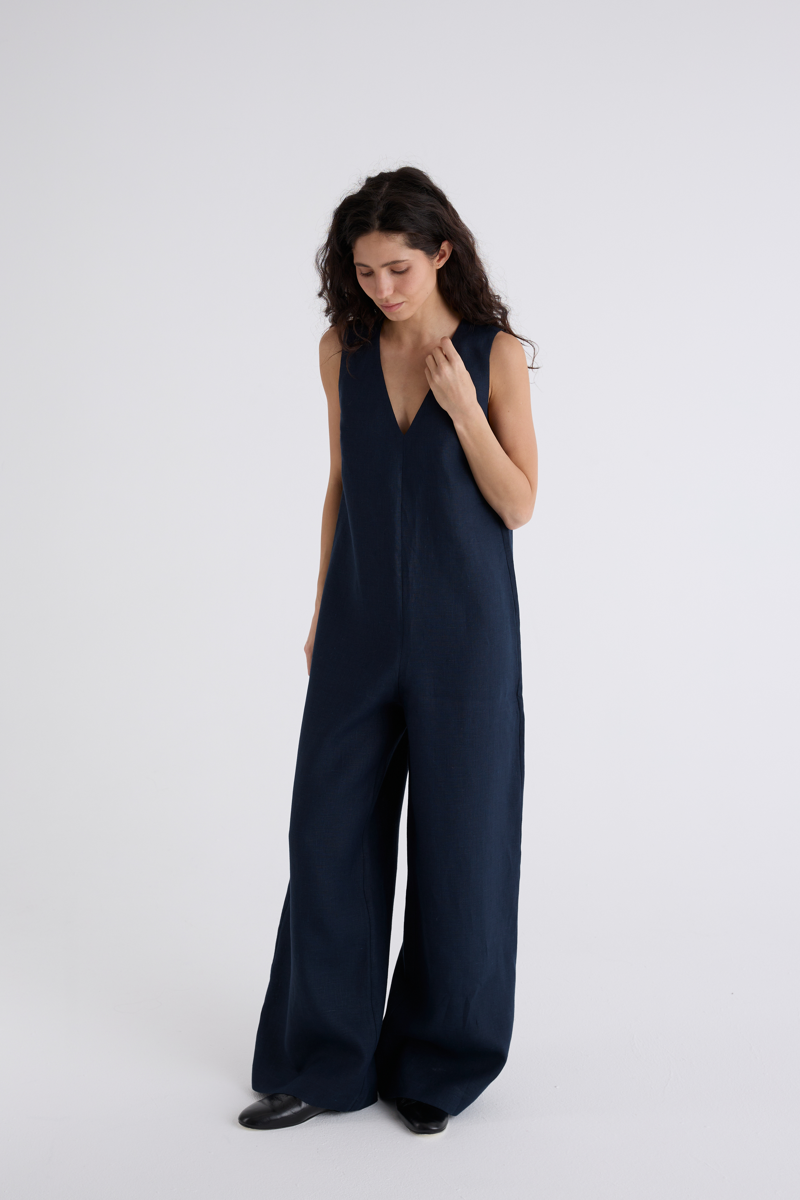 Комбинезон изо льна 100%. Плотный костюмный лён не просвечивает и держит форму. С V-образным вырезом. Сзади застёжка на пуговицу.