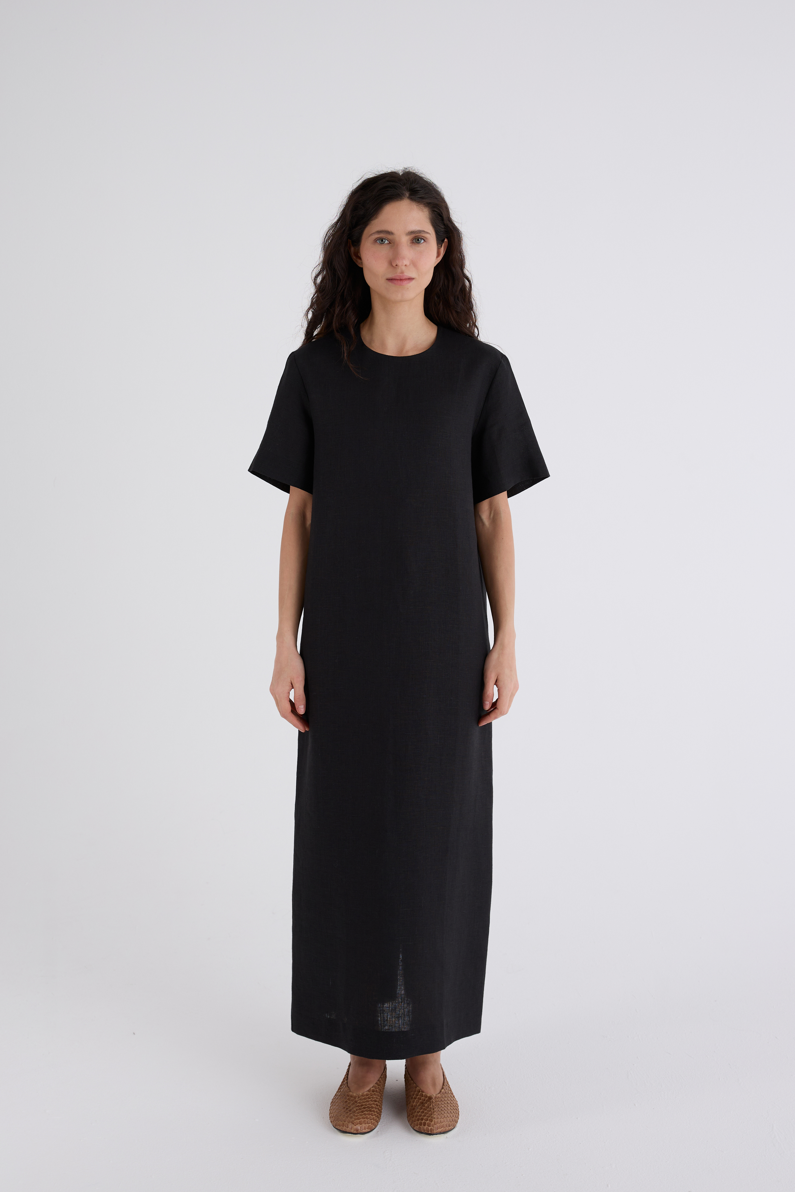 Платье Агата изо льна 100%. Платье прямого силуэта, с комфортным коротким рукавом. Сзади разрез - шлица, сверху застёжка на одной пуговице. Платье выполнено из гладкого костюмного льна. Создаёт красивый силуэт.