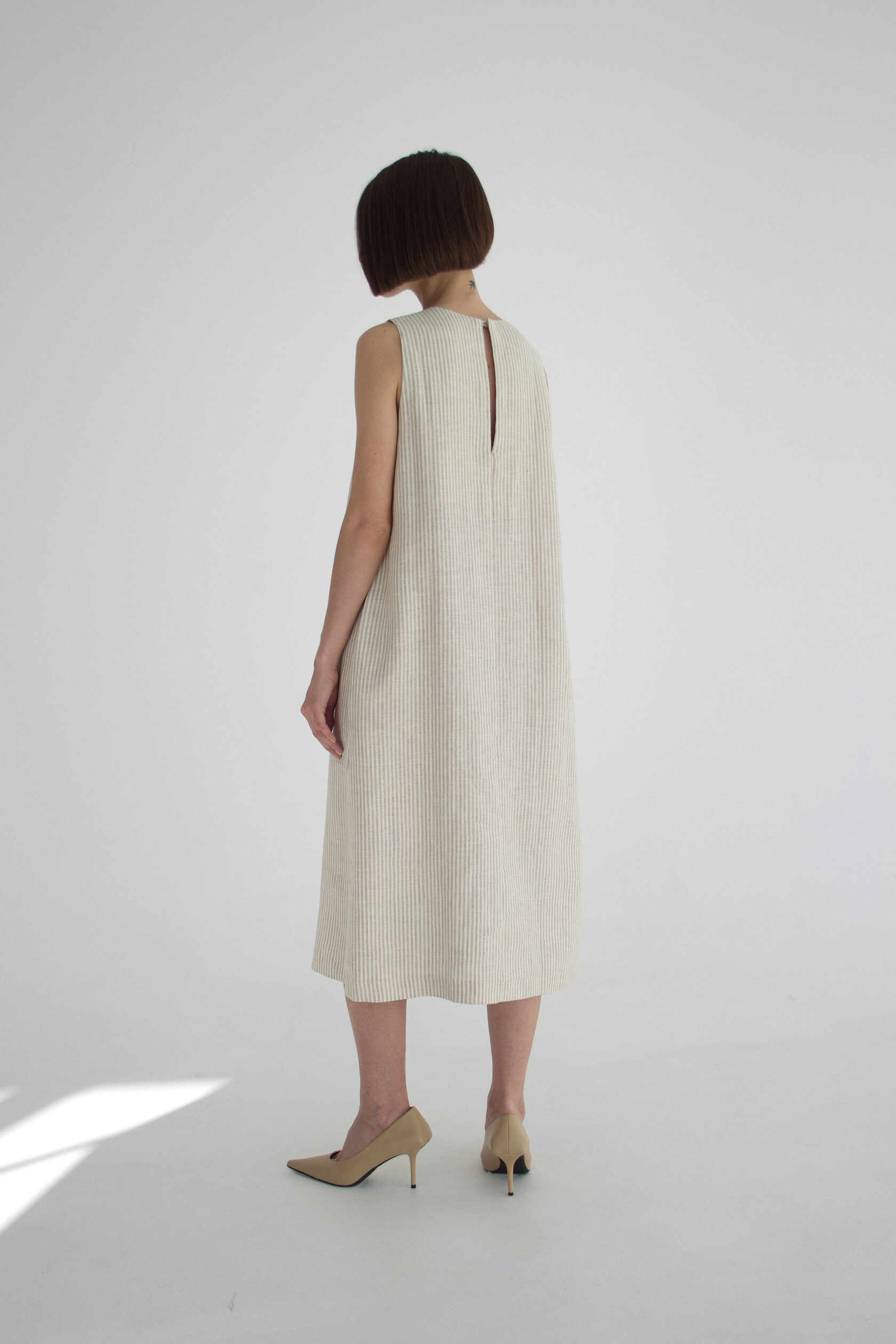 Тестовый экземпляр. Платье А-силуэта изо льна 100%. Карманы по бокам. Сзади застежка. Фактурная, объемная ткань с шитьем. Сзади пуговица.