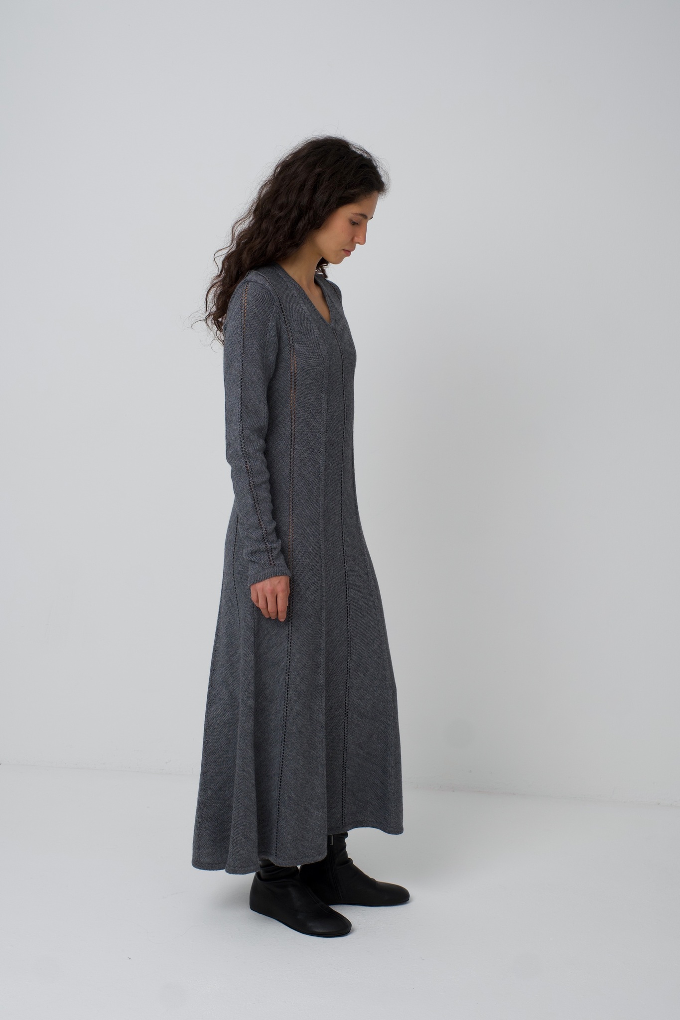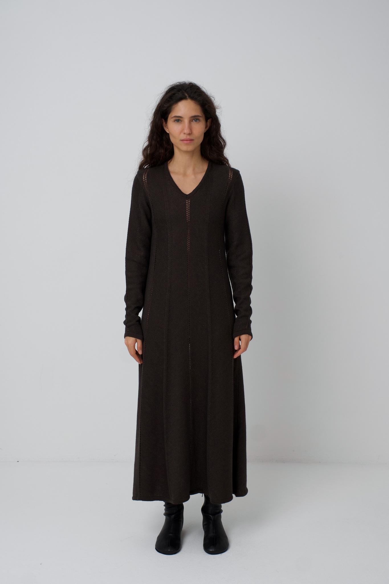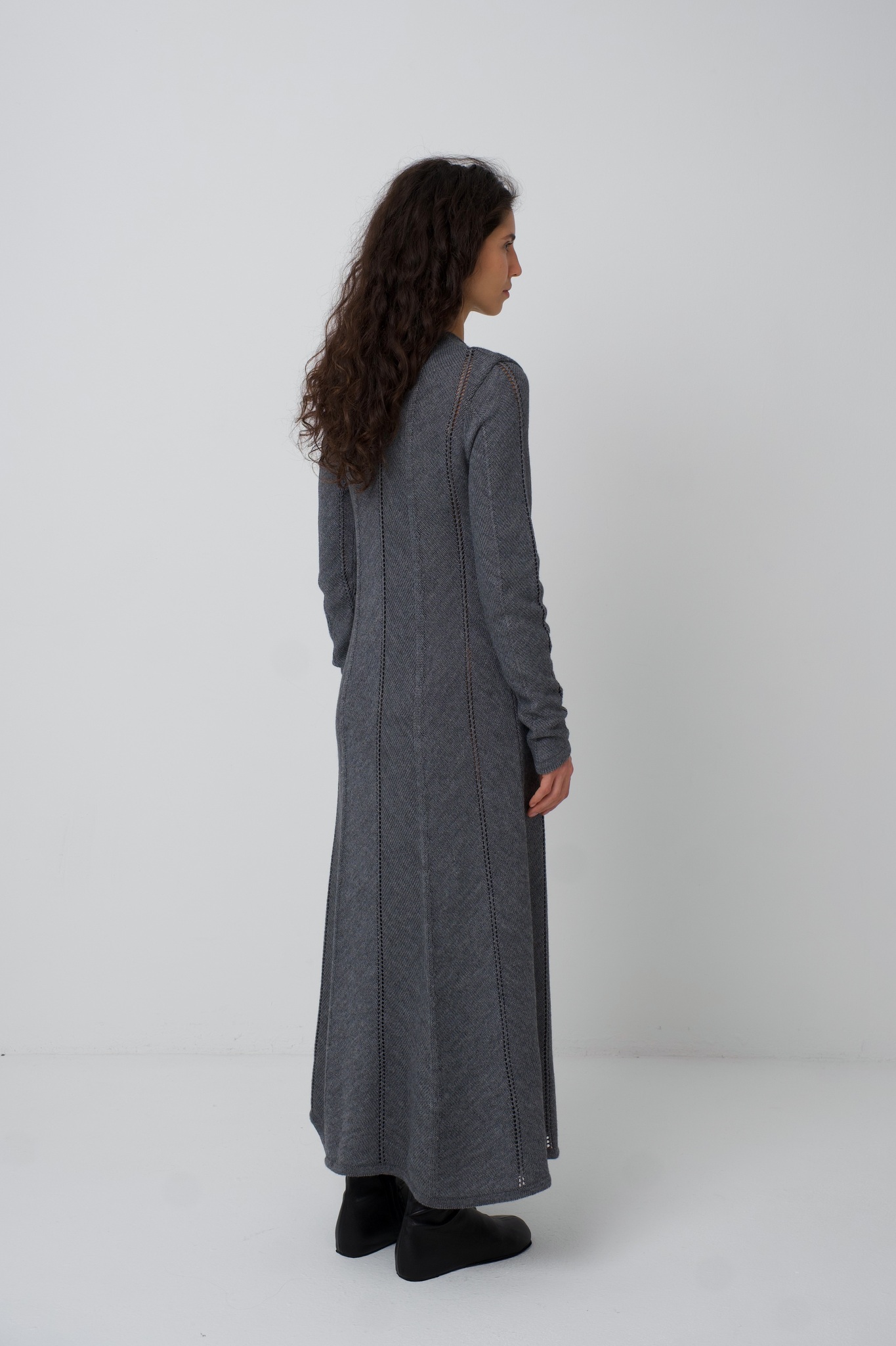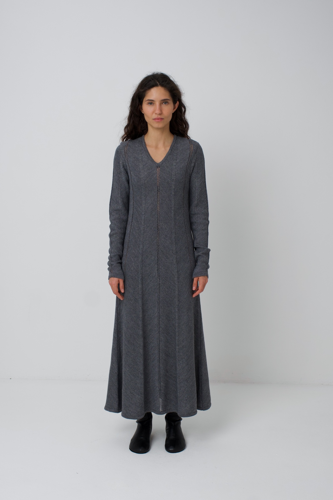 Платье Zoe. Вязаное платье, рисунок вязки и диагональное расположение частей платья создают ощущение кроя по косой. Платье подчёркивает фигуру сверху, при этом не обтягивая, и красиво расширяется в районе талии и к низу. Ажурные полоски деликатны и вытягивают фигуру. V-образный вырез вытягивает шею и силуэт. Удлинённый и фигурный низ рукава красиво сочетается с диагональной вязкой. Мы сделали это платье ещё и с интересным выбором состава. С помощью специальной техники, мы "нижний слой" сделали хлопок/акрил (тактильно он нежный и приятный), а "верхний слой" сделали меринос/акрил (добавляет тепло). Обращаем внимание: для вязаных изделий допустимо расхождение от заявленных параметров на +-3 см.