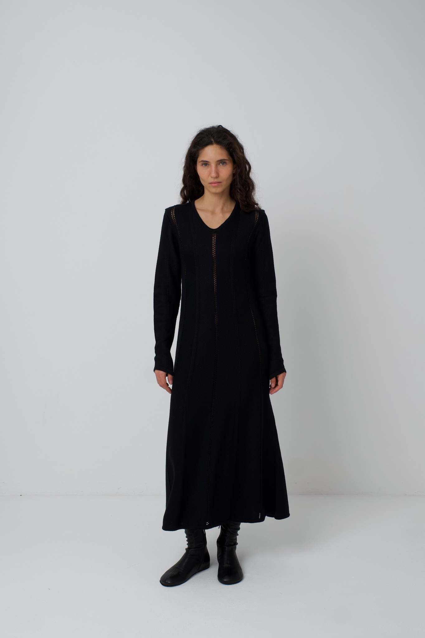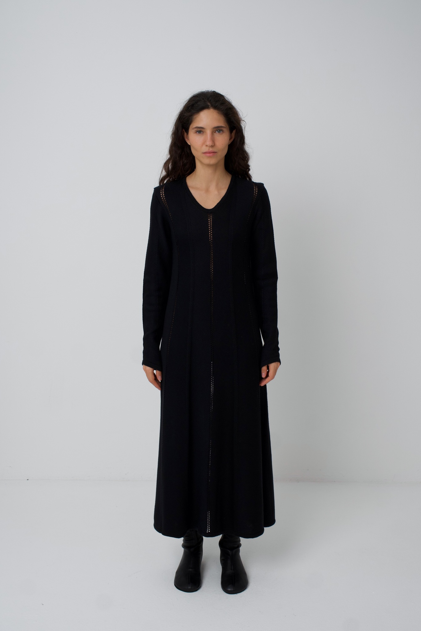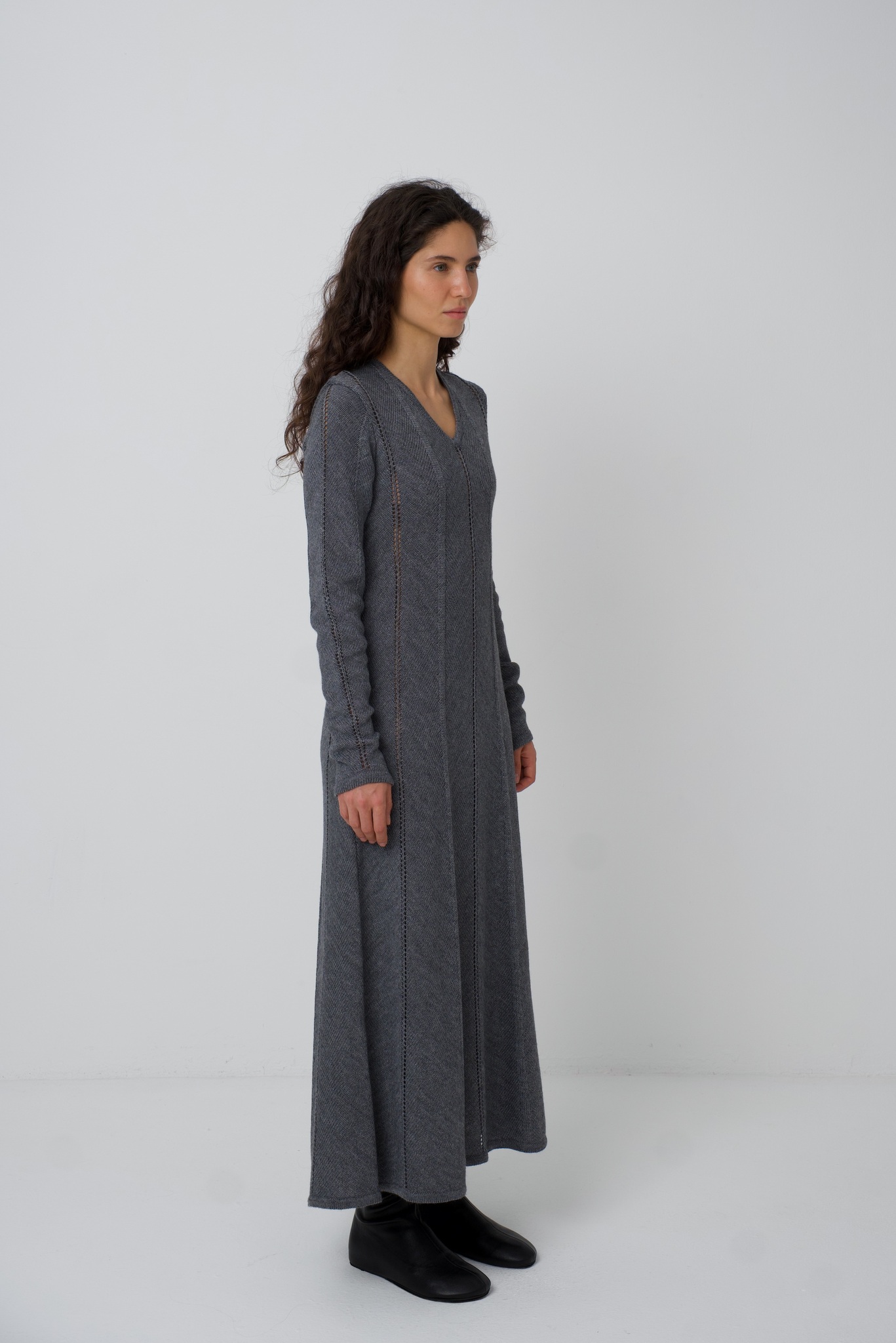 Платье Zoe. Вязаное платье, рисунок вязки и диагональное расположение частей платья создают ощущение кроя по косой. Платье подчёркивает фигуру сверху, при этом не обтягивая, и красиво расширяется в районе талии и к низу. Ажурные полоски деликатны и вытягивают фигуру. V-образный вырез вытягивает шею и силуэт. Удлинённый и фигурный низ рукава красиво сочетается с диагональной вязкой. Мы сделали это платье ещё и с интересным выбором состава. С помощью специальной техники, мы "нижний слой" сделали хлопок/акрил (тактильно он нежный и приятный), а "верхний слой" сделали меринос/акрил (добавляет тепло). Обращаем внимание: для вязаных изделий допустимо расхождение от заявленных параметров на +-3 см.