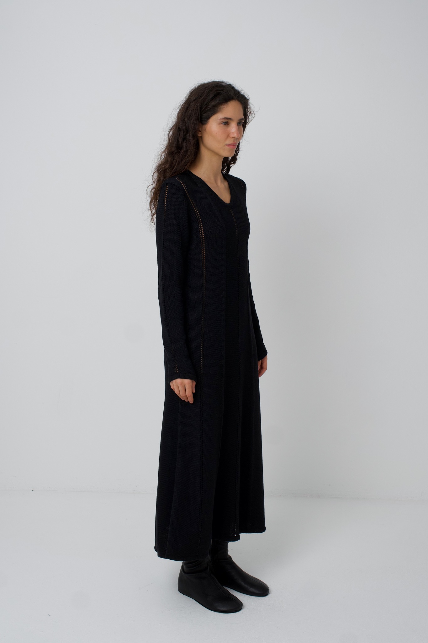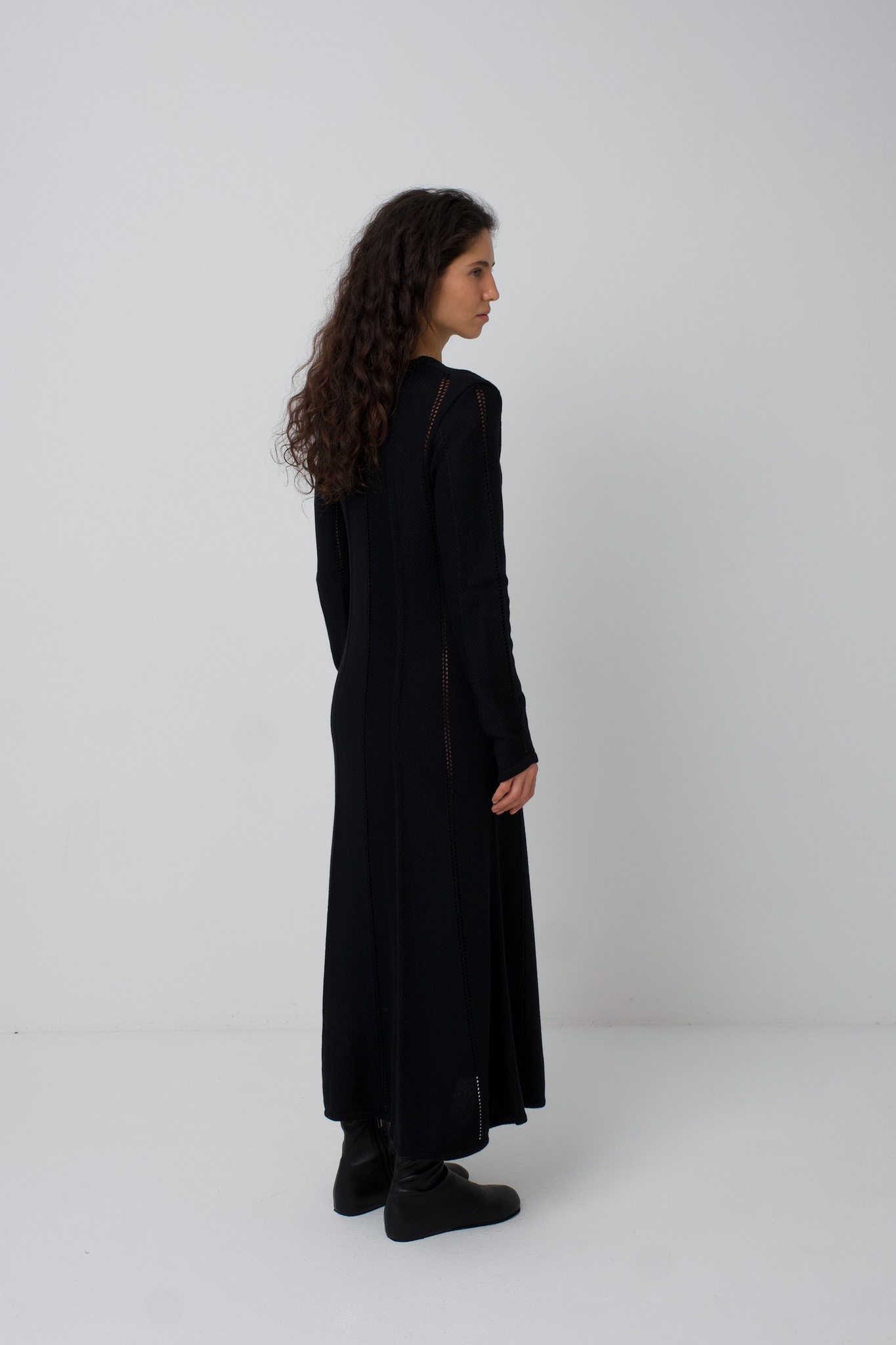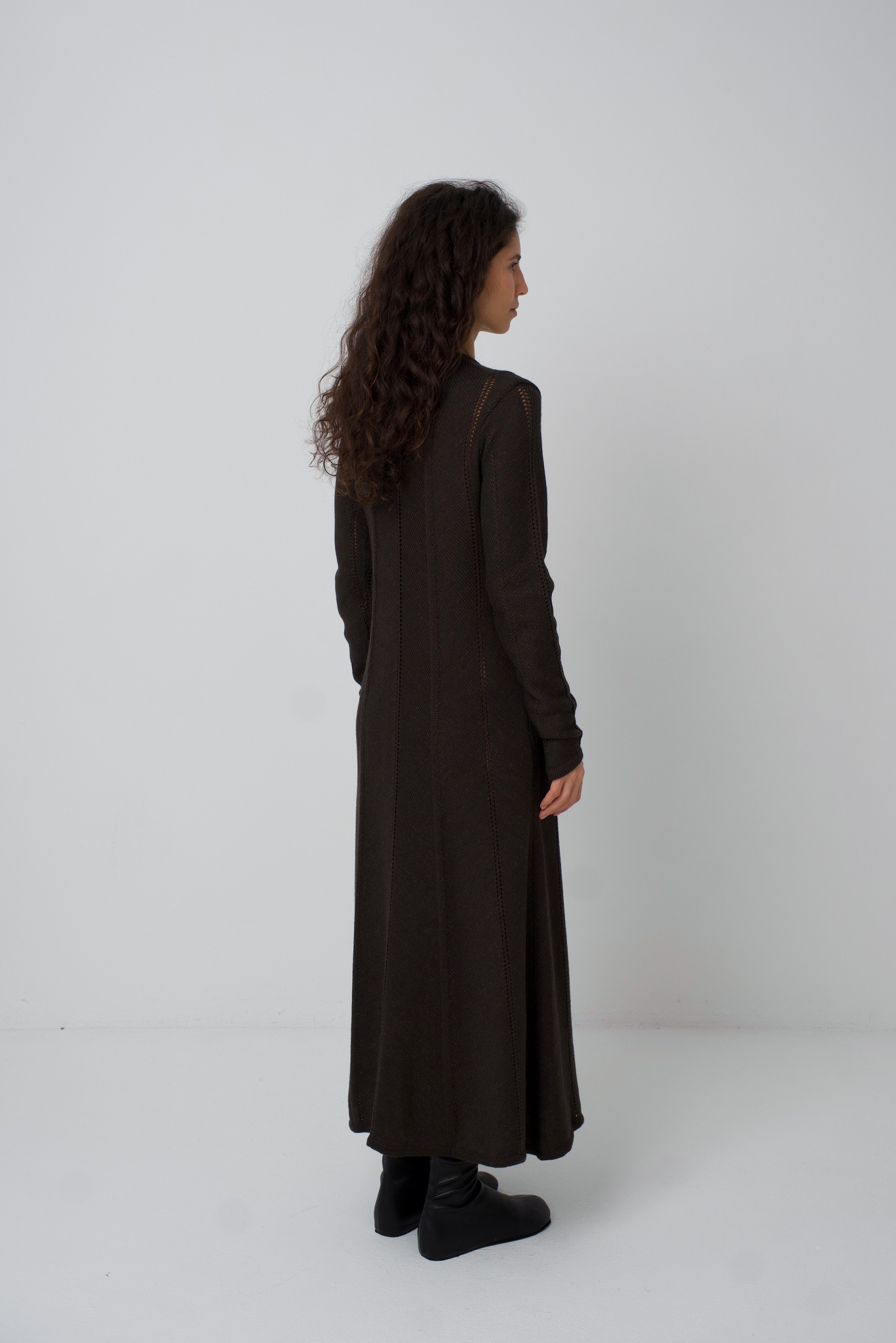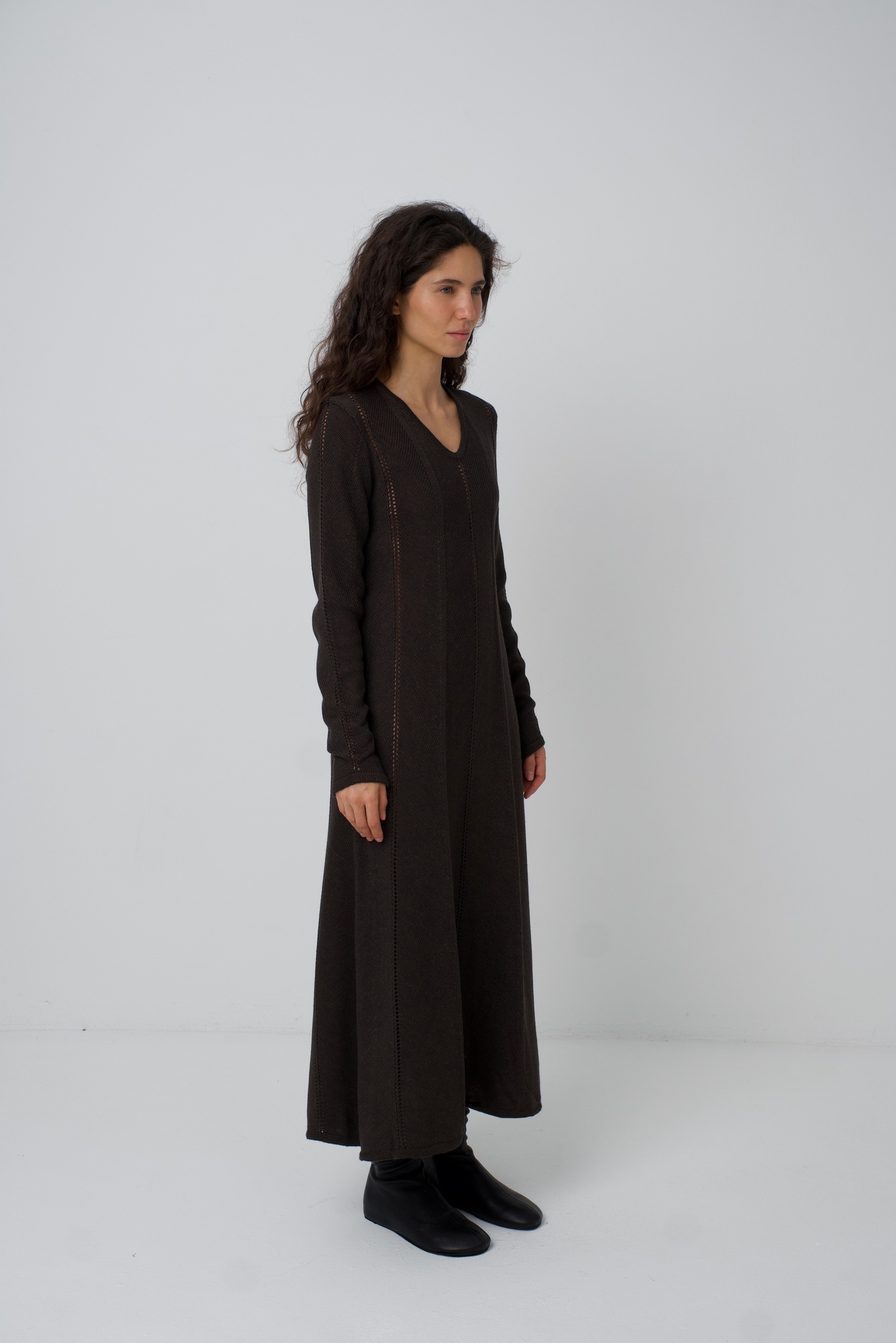 Платье Zoe. Вязаное платье, рисунок вязки и диагональное расположение частей платья создают ощущение кроя по косой. Платье подчёркивает фигуру сверху, при этом не обтягивая, и красиво расширяется в районе талии и к низу. Ажурные полоски деликатны и вытягивают фигуру. V-образный вырез вытягивает шею и силуэт. Удлинённый и фигурный низ рукава красиво сочетается с диагональной вязкой. Мы сделали это платье ещё и с интересным выбором состава. С помощью специальной техники, мы "нижний слой" сделали хлопок/акрил (тактильно он нежный и приятный), а "верхний слой" сделали меринос/акрил (добавляет тепло). Обращаем внимание: для вязаных изделий допустимо расхождение от заявленных параметров на +-3 см.