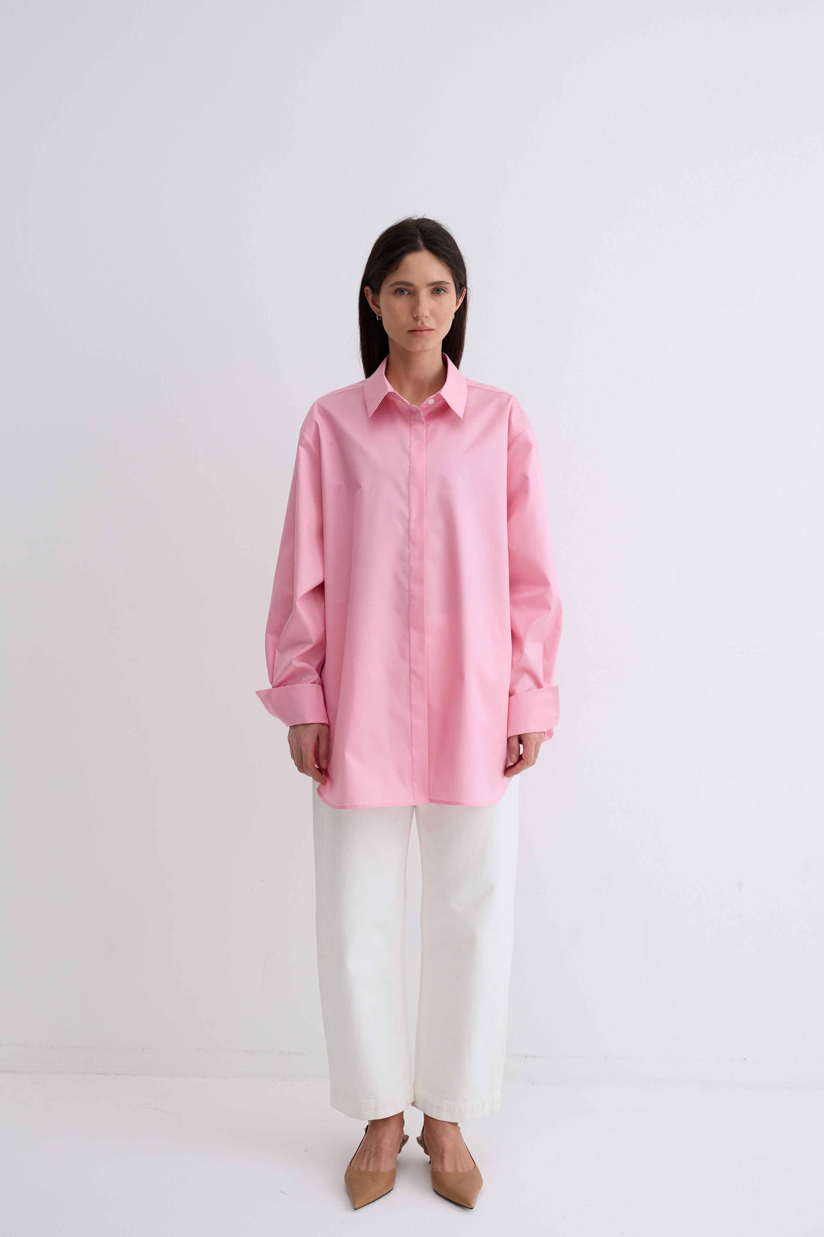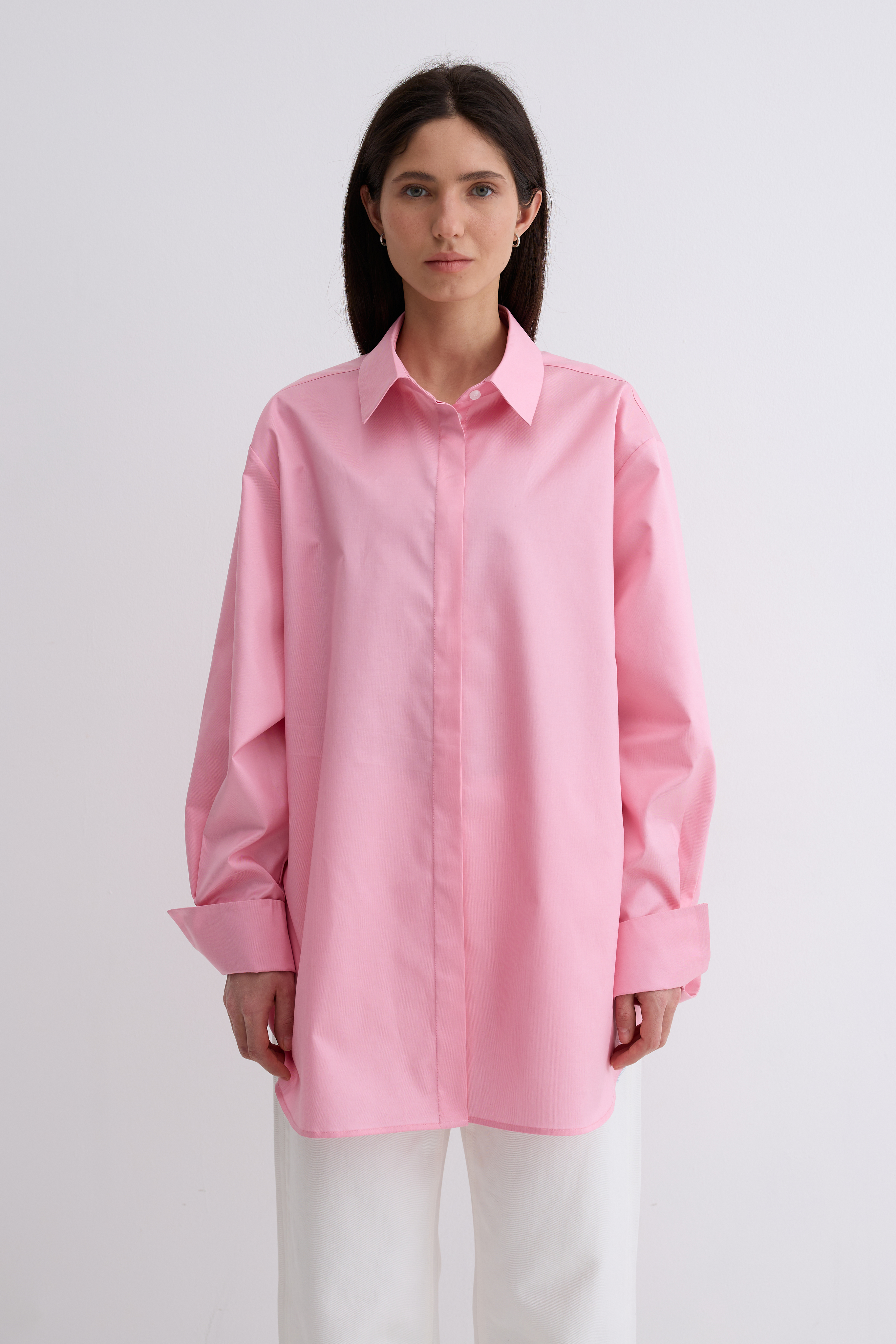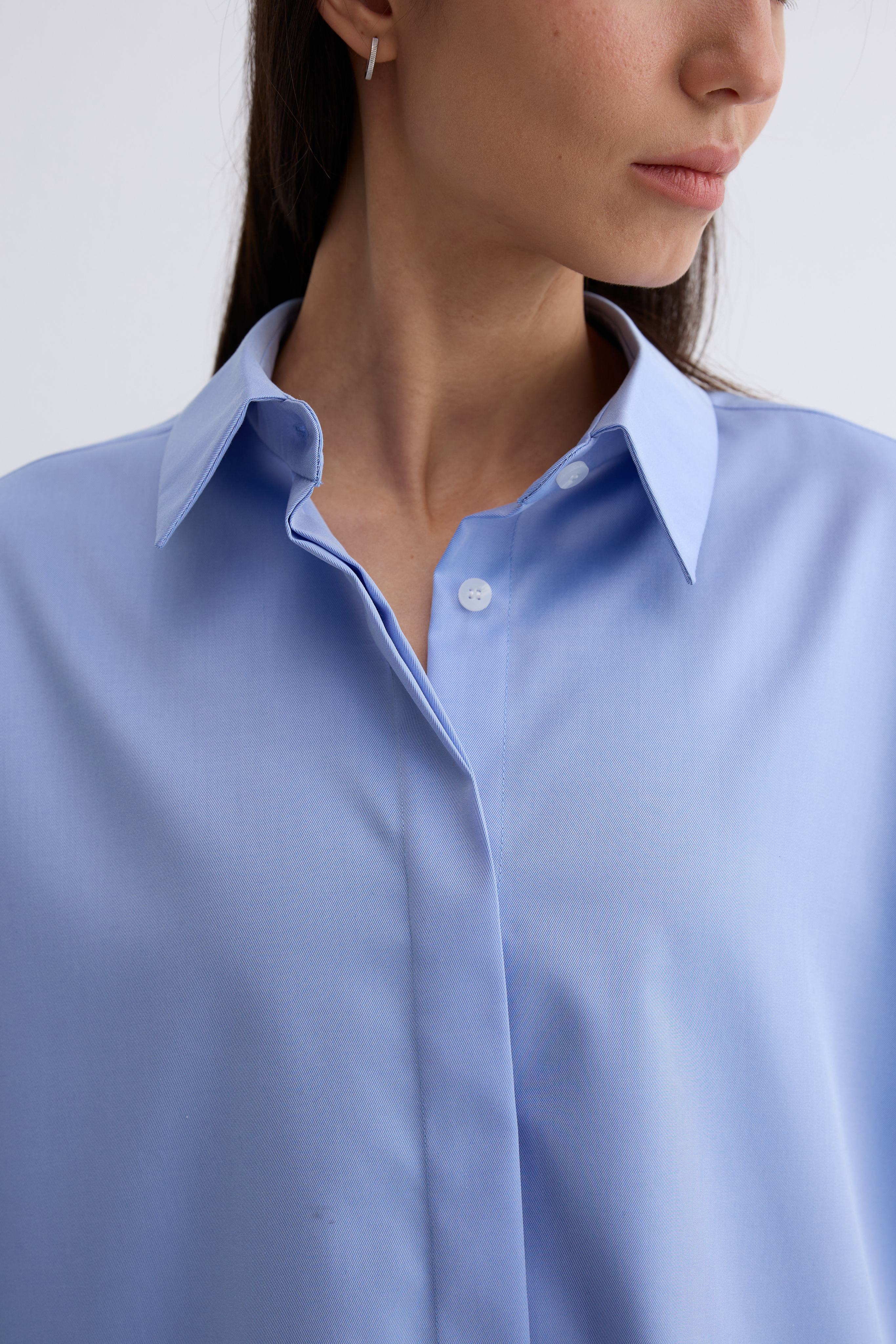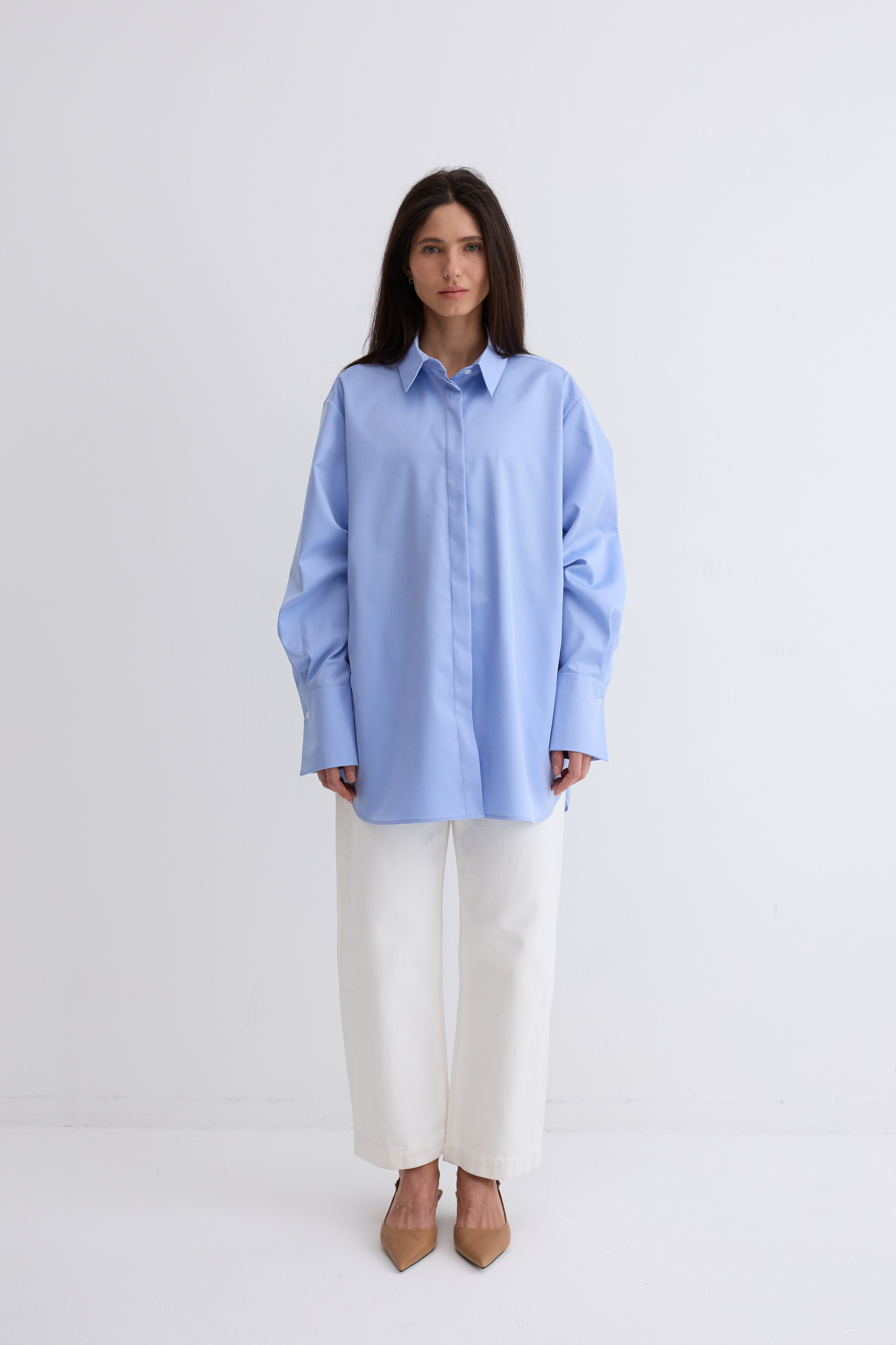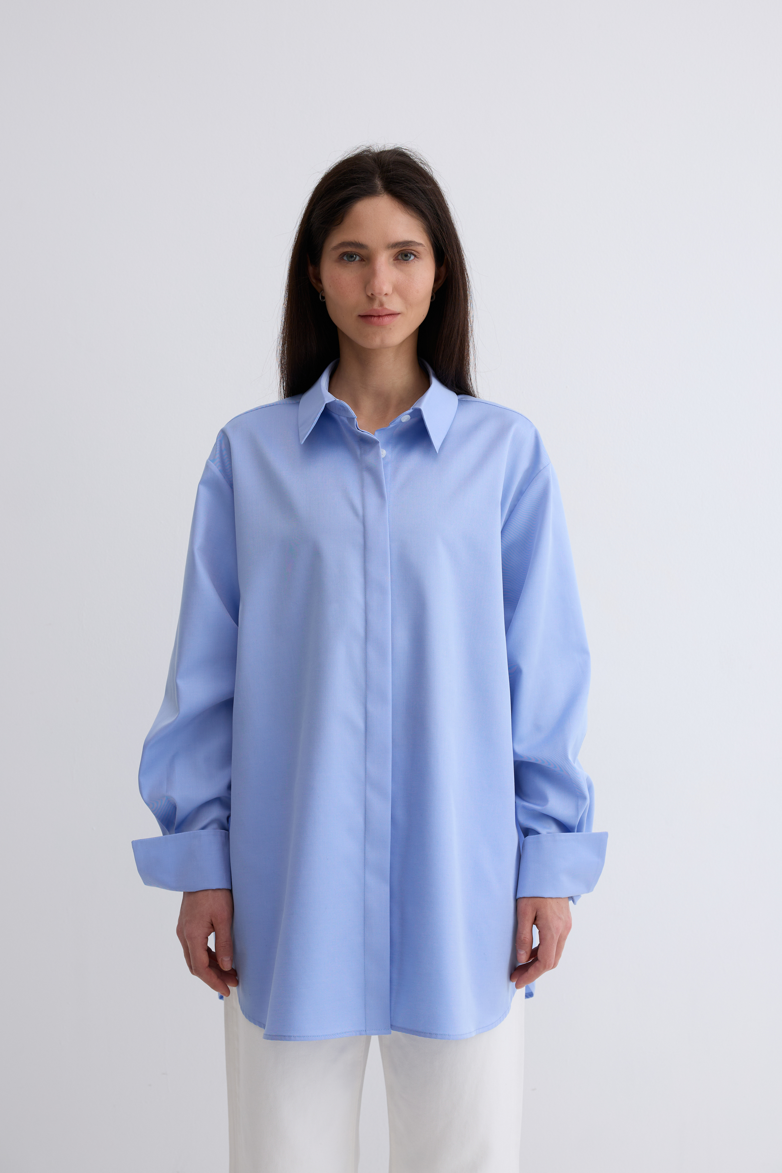 Рубашка Кира из 100% хлопка. Объемная акцентная рубашка. Держит форму, не просвечивает. Закрытая планка не будет привлекать внимание к пуговицам и позволит добавить в образ любые аксессуары. Широкие манжеты, которые можно оставить такими или сделать классический вариант подвернув их.