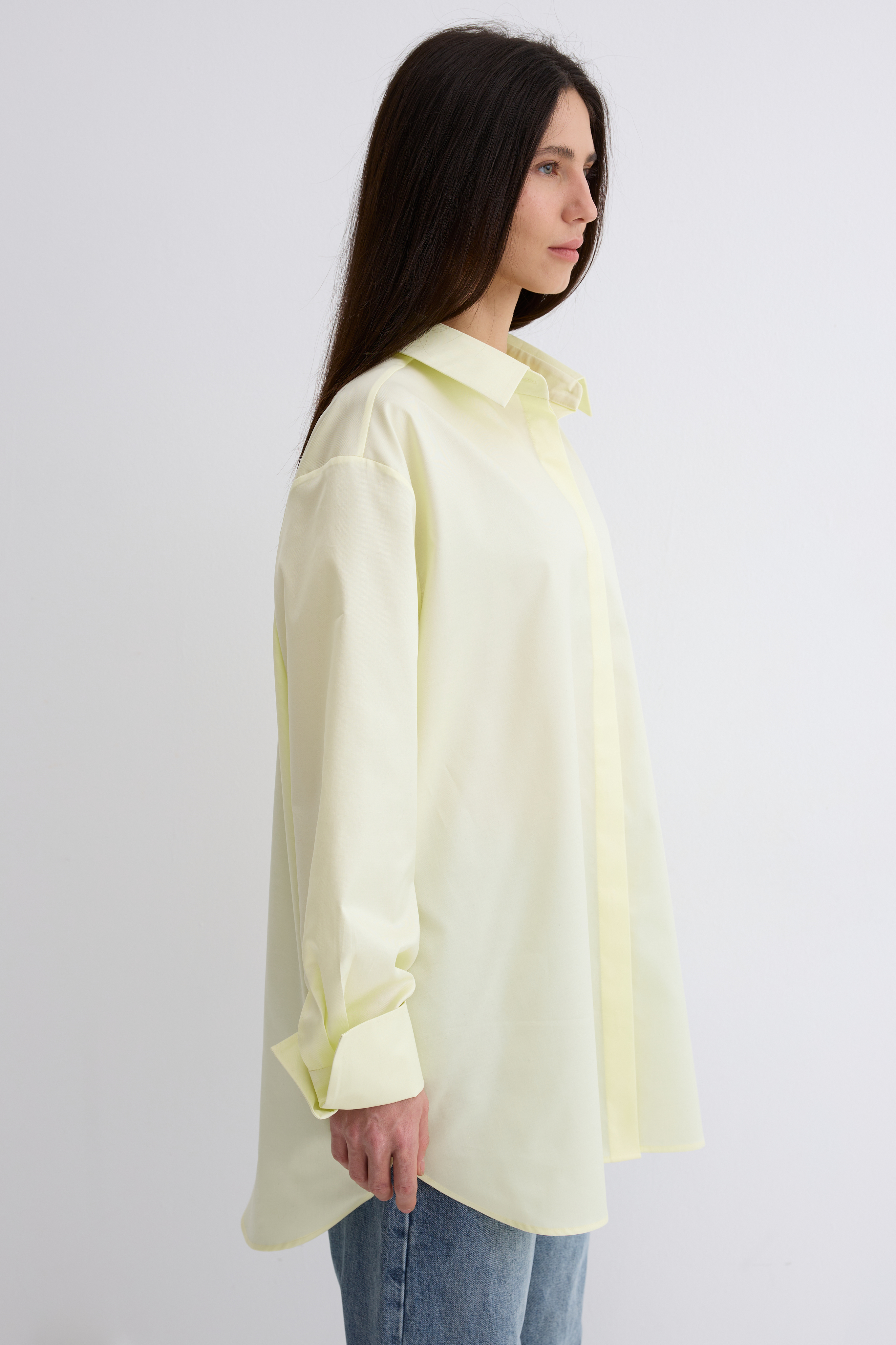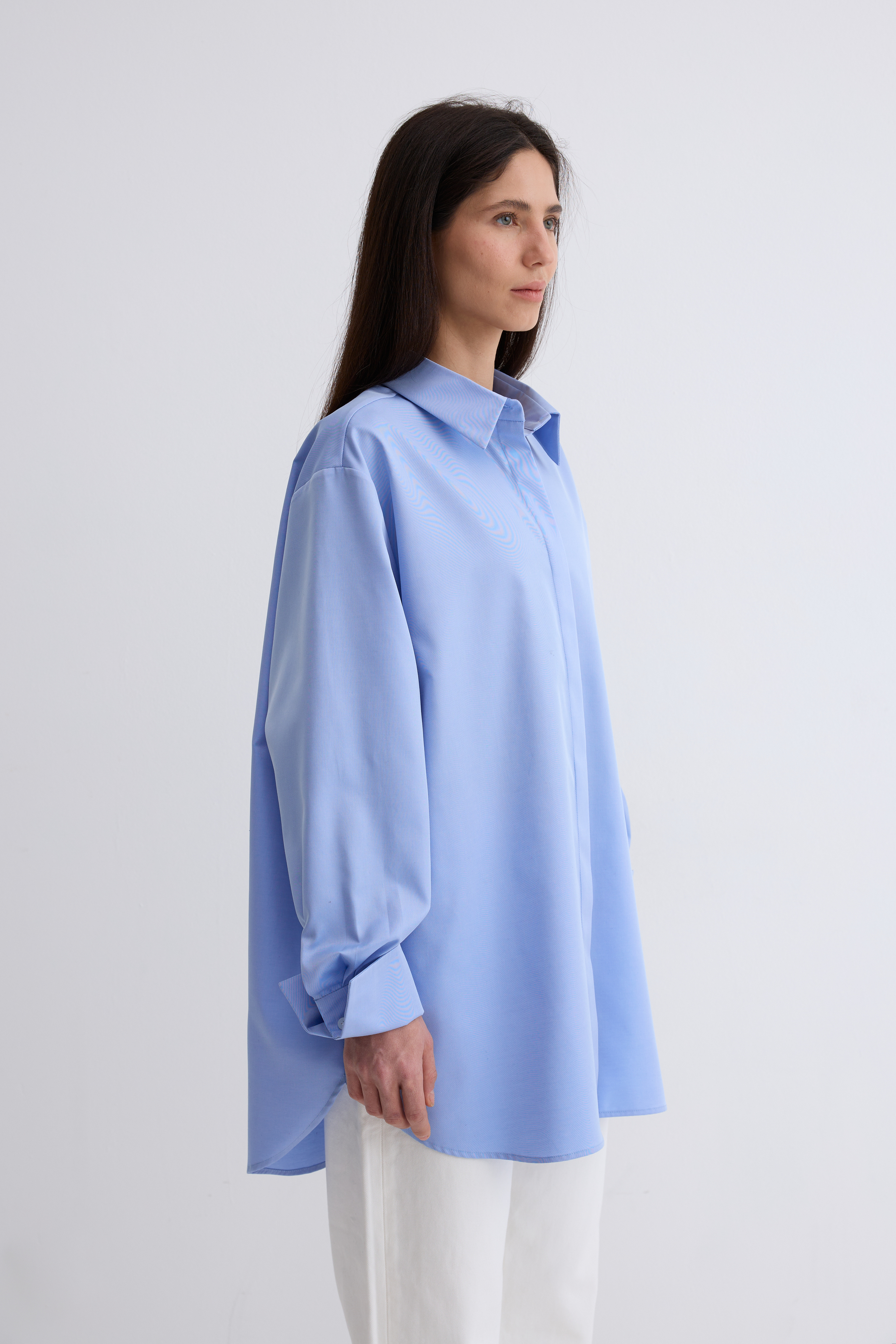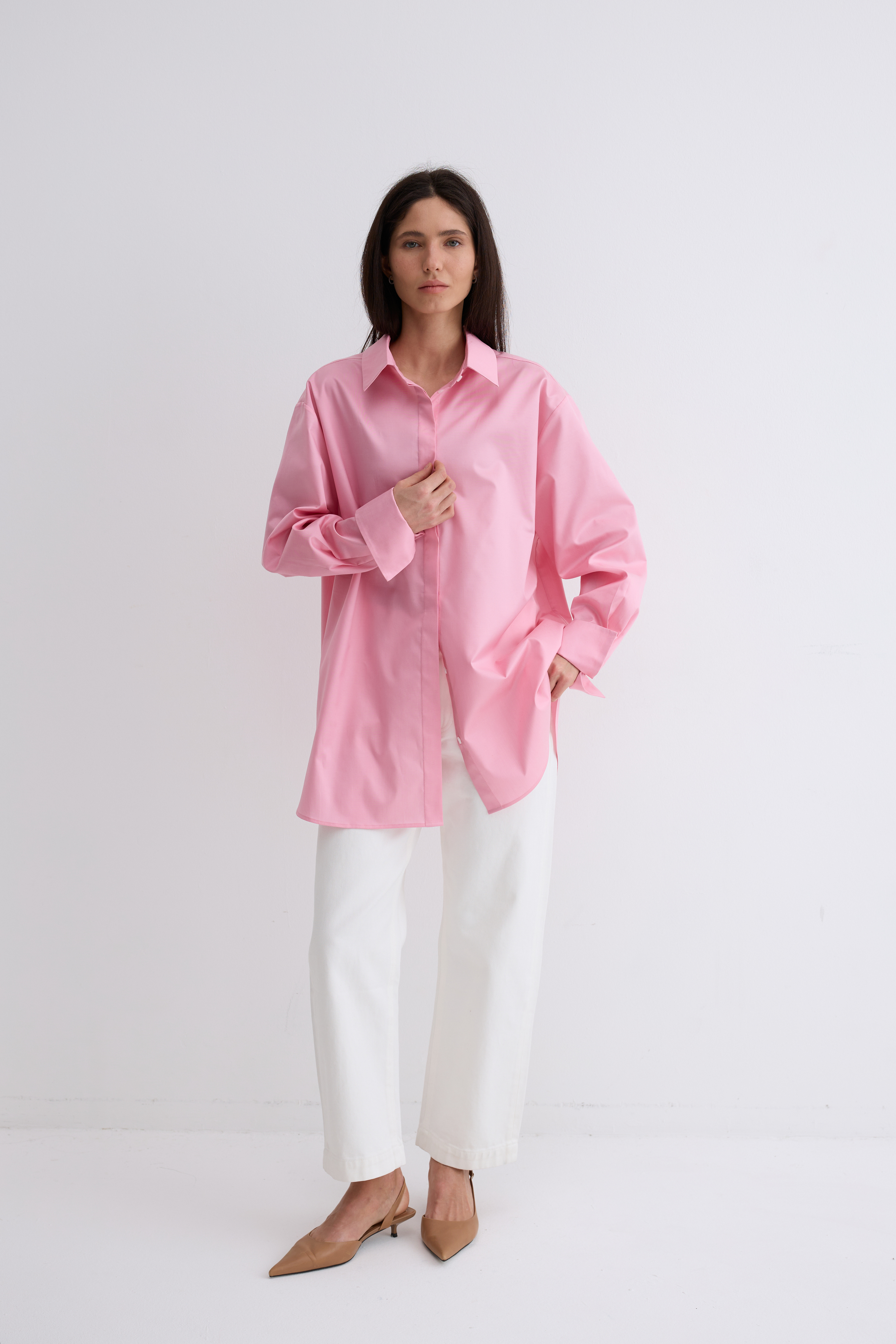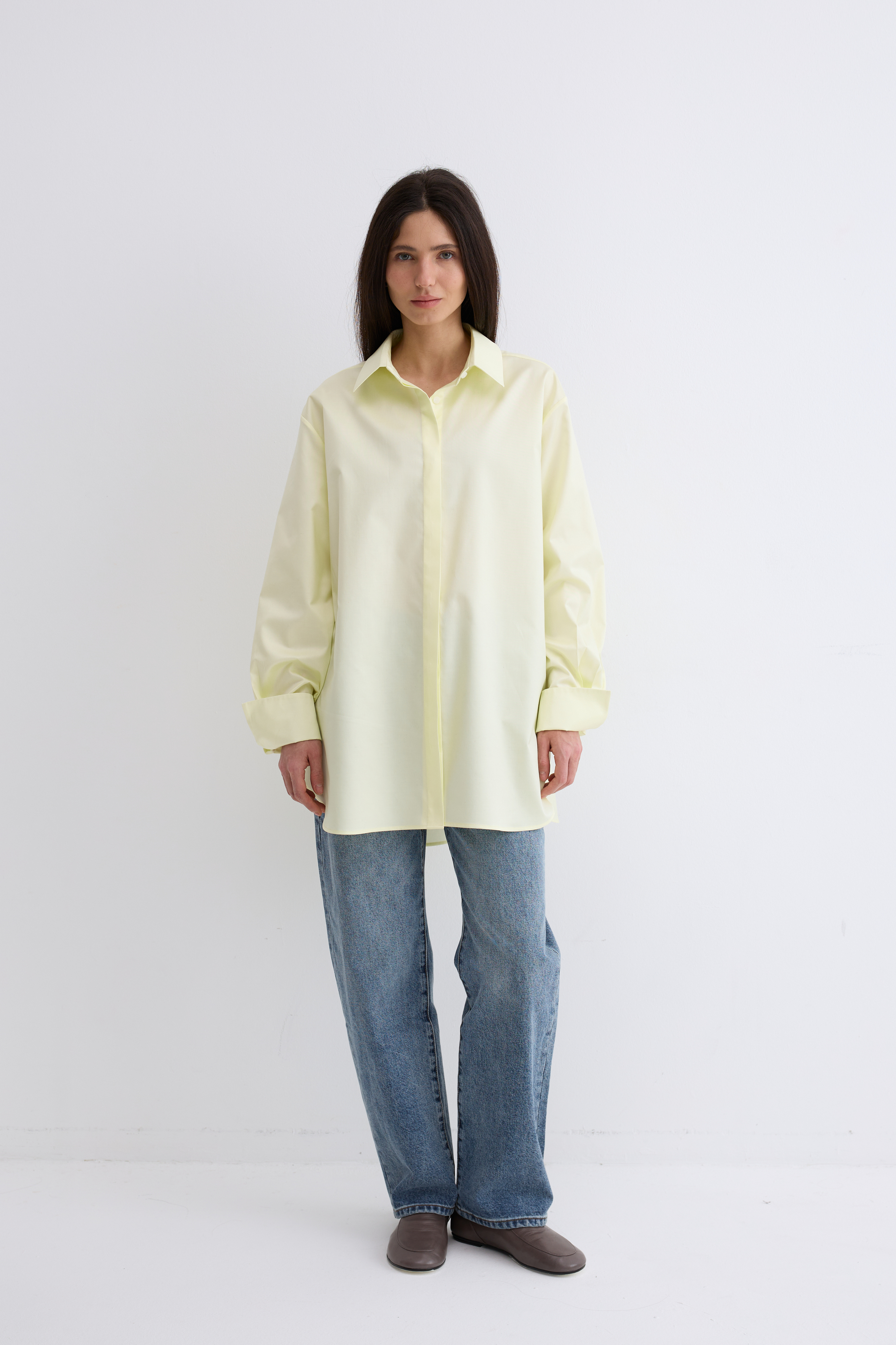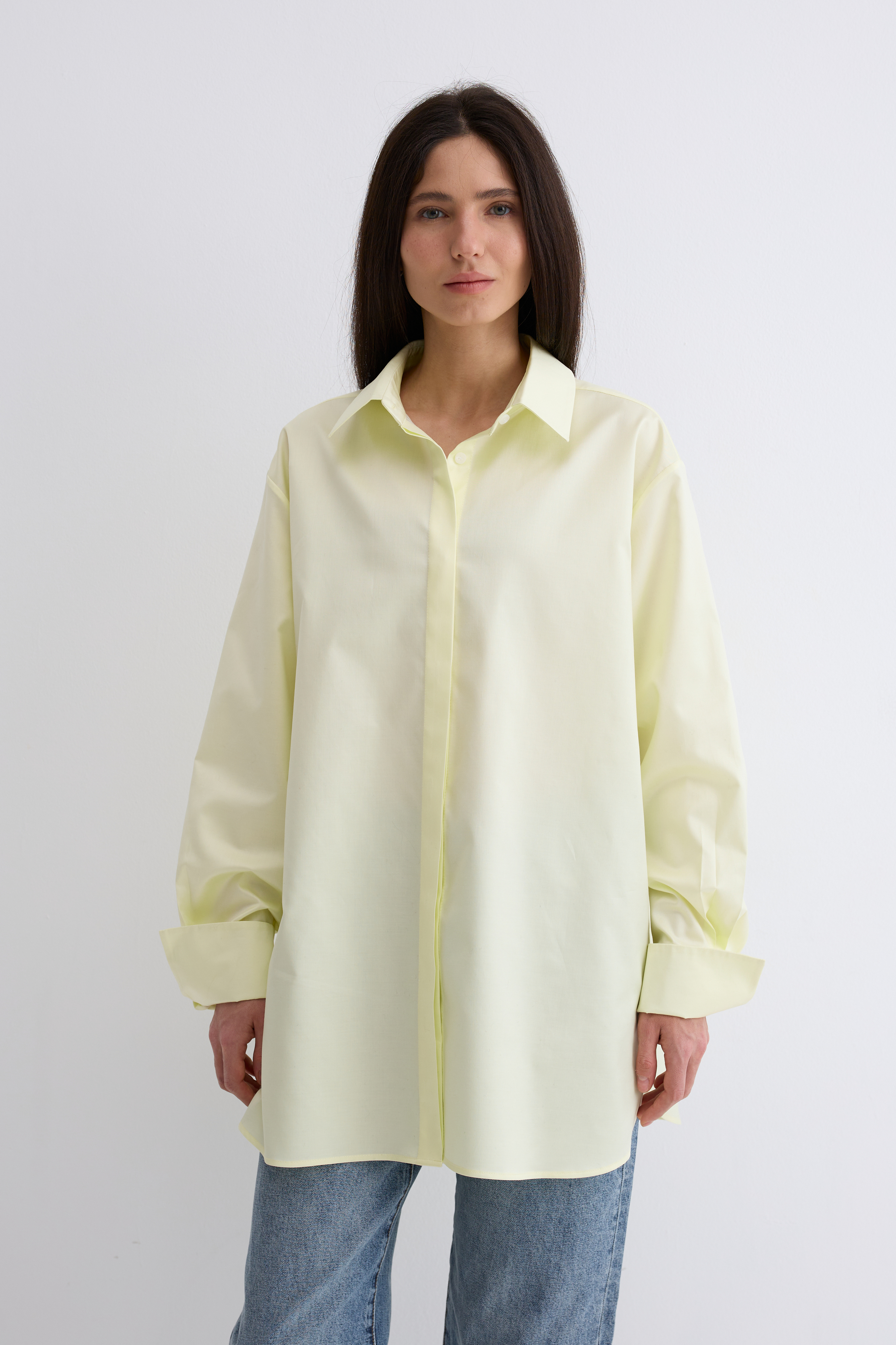 Рубашка Кира из 100% хлопка. Объемная акцентная рубашка. Держит форму, не просвечивает. Закрытая планка не будет привлекать внимание к пуговицам и позволит добавить в образ любые аксессуары. Широкие манжеты, которые можно оставить такими или сделать классический вариант подвернув их.
