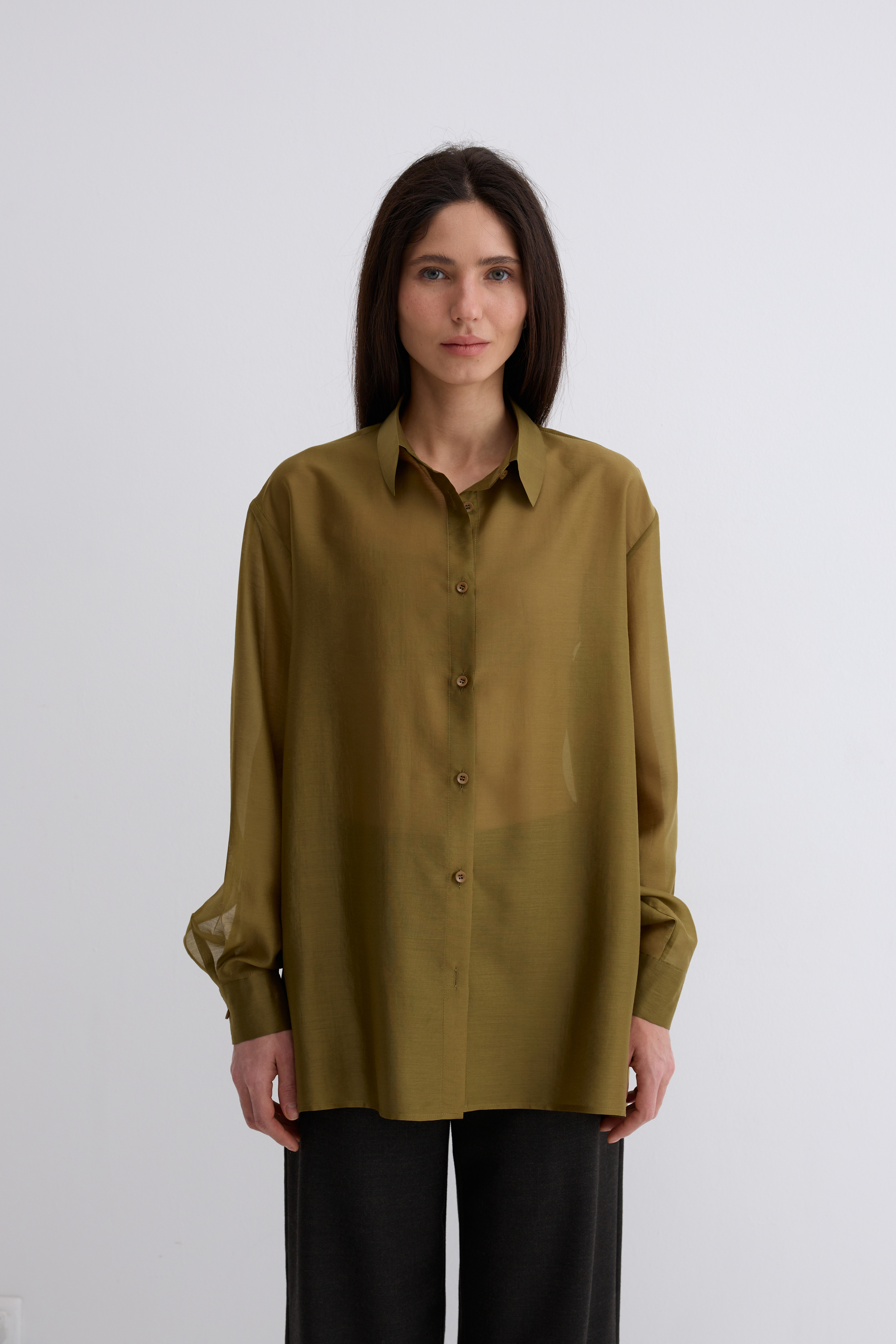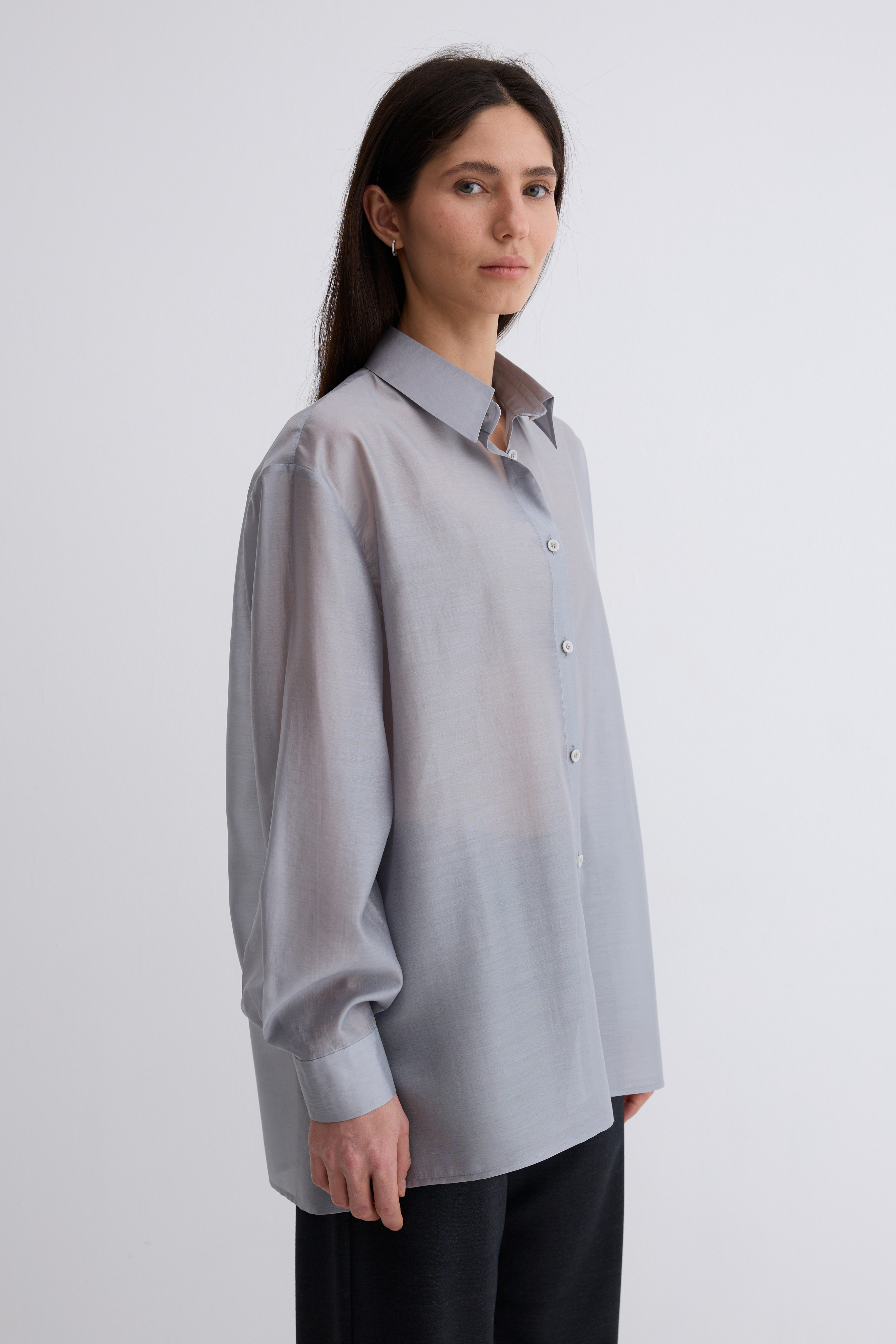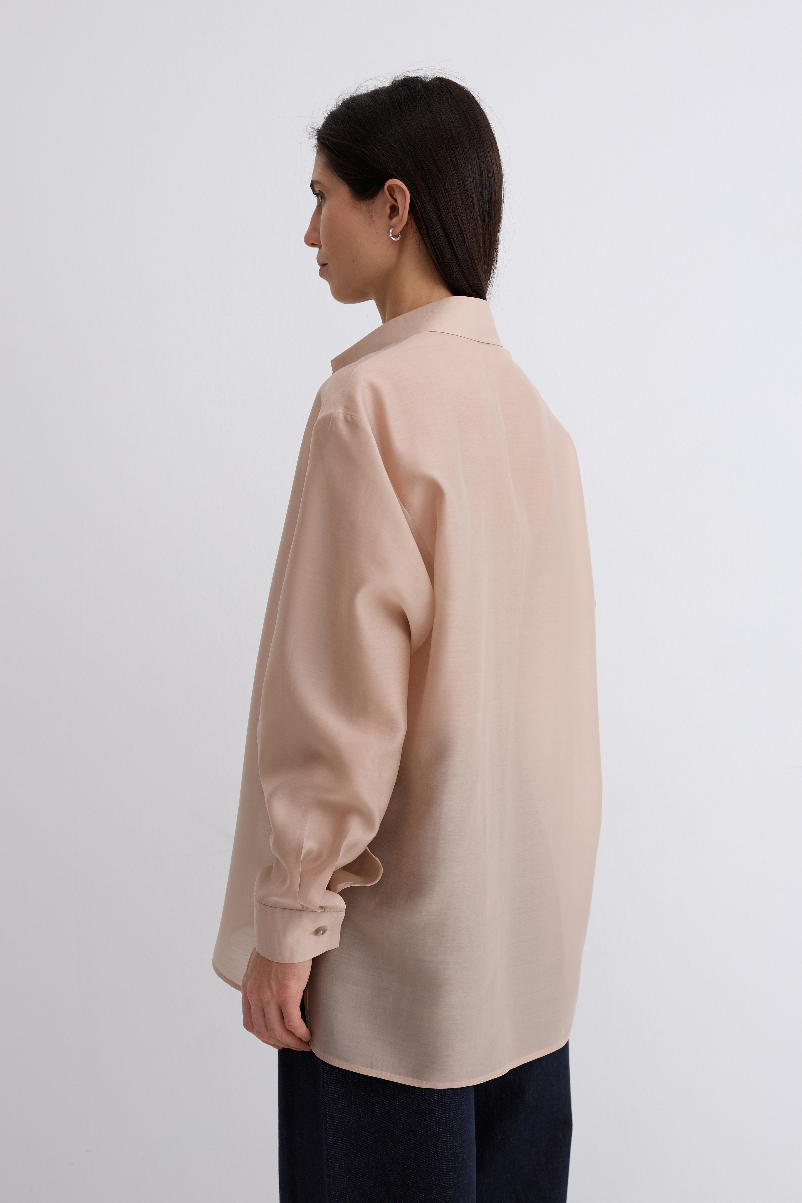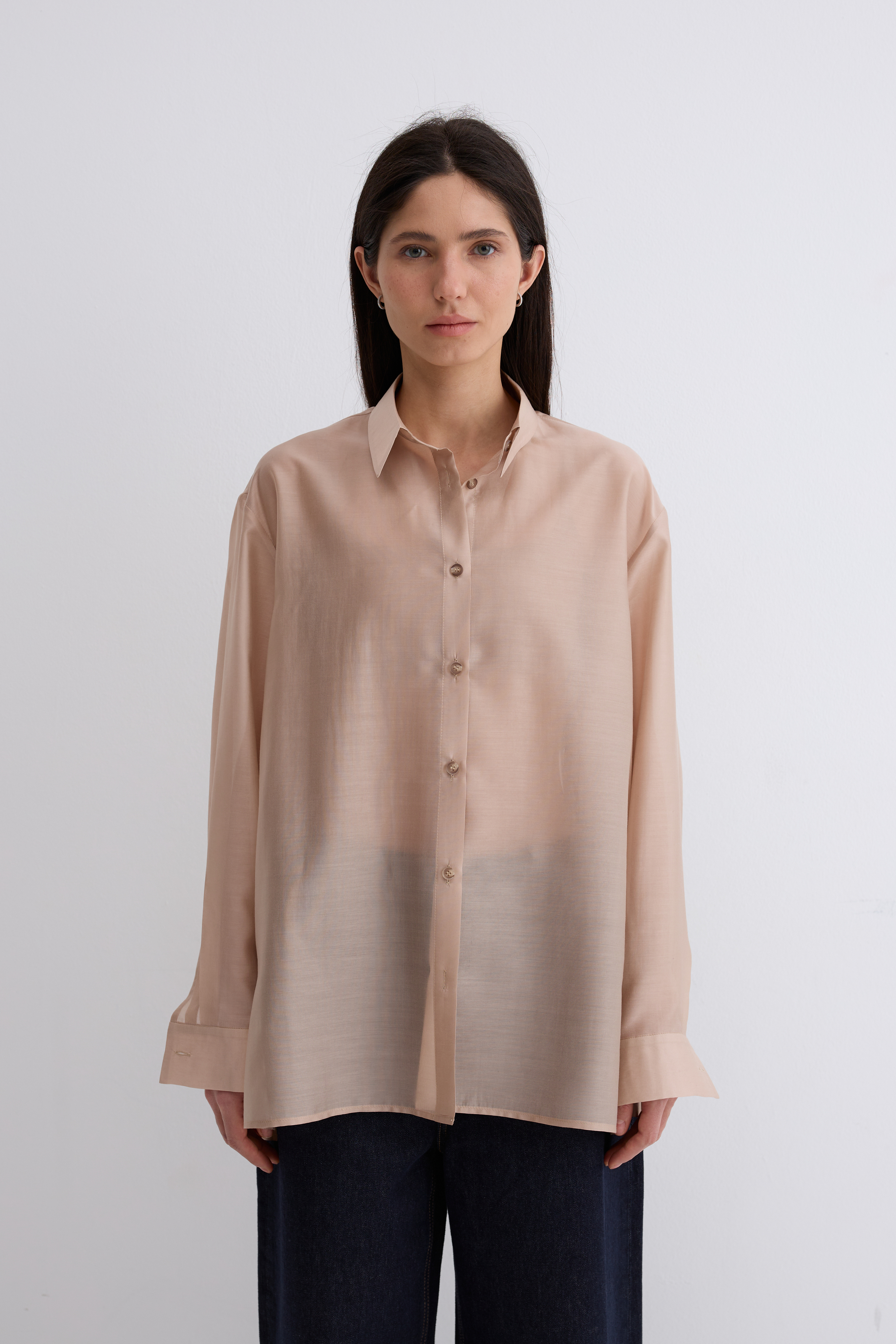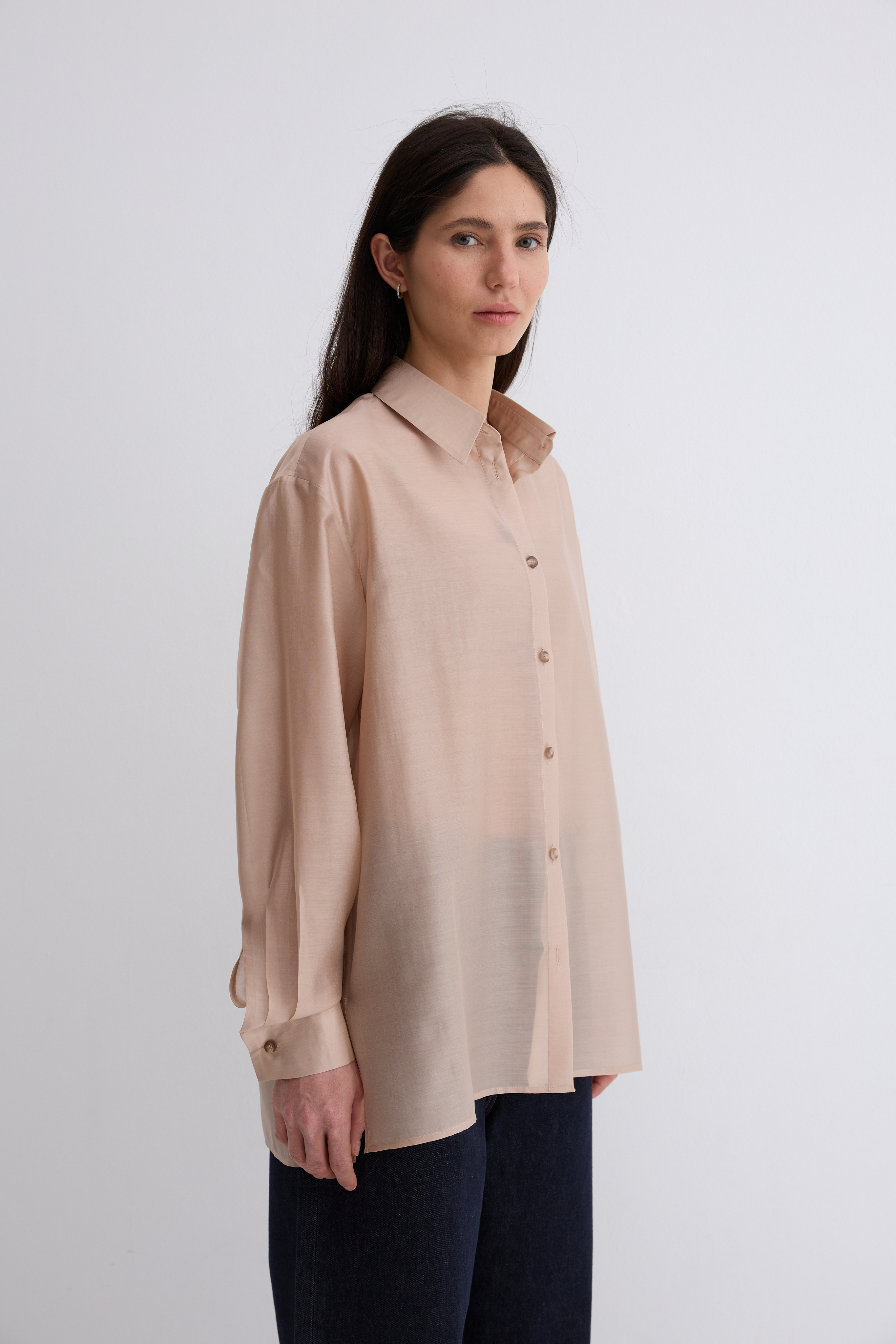 Рубашка Ветер. Классическая рубашка свободного кроя. Шелковистая, воздушная, при это ткань немного сухая, что создает форму, а не свивает. По бокам разрезы. Рубашка просвечивает. Размер единый.