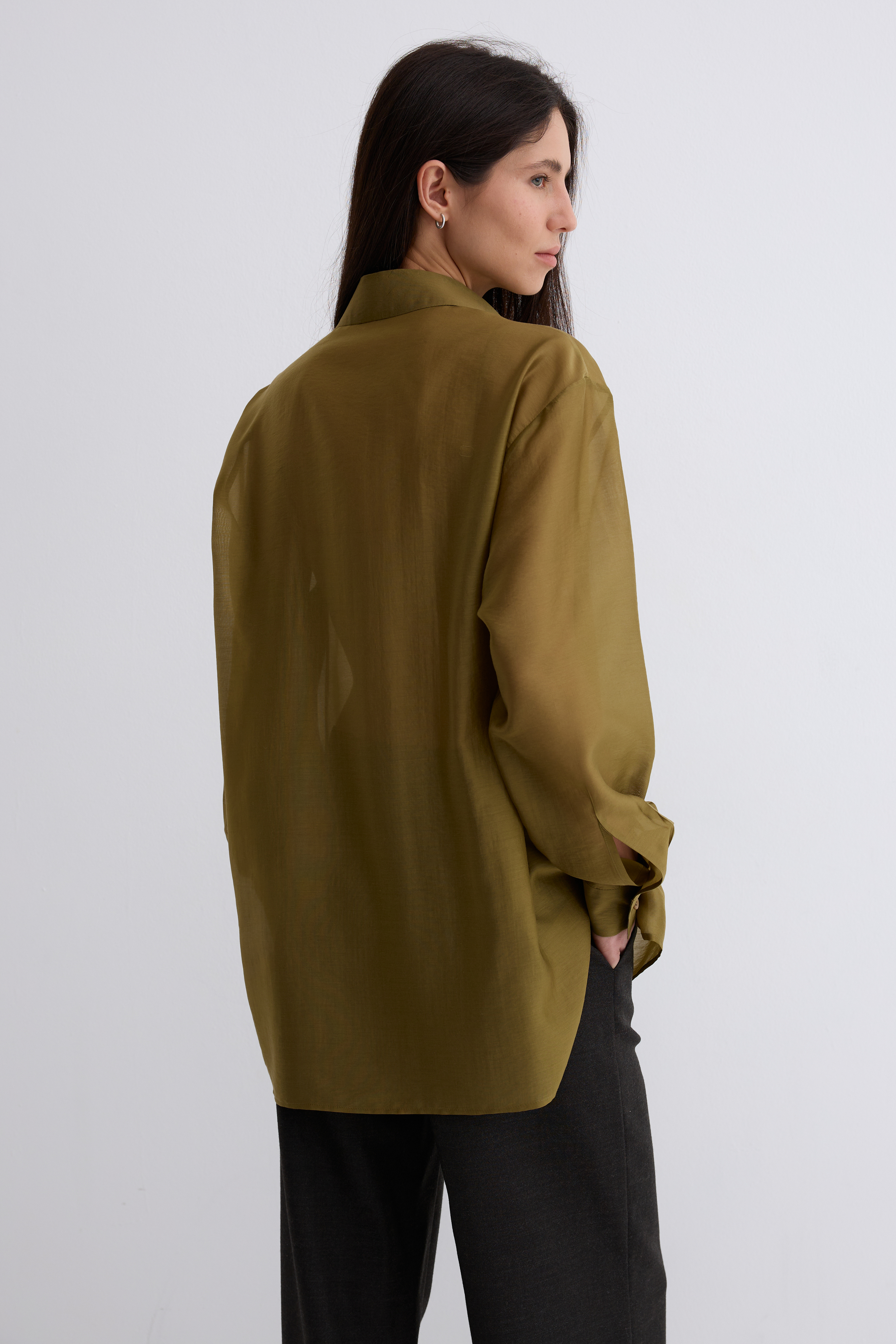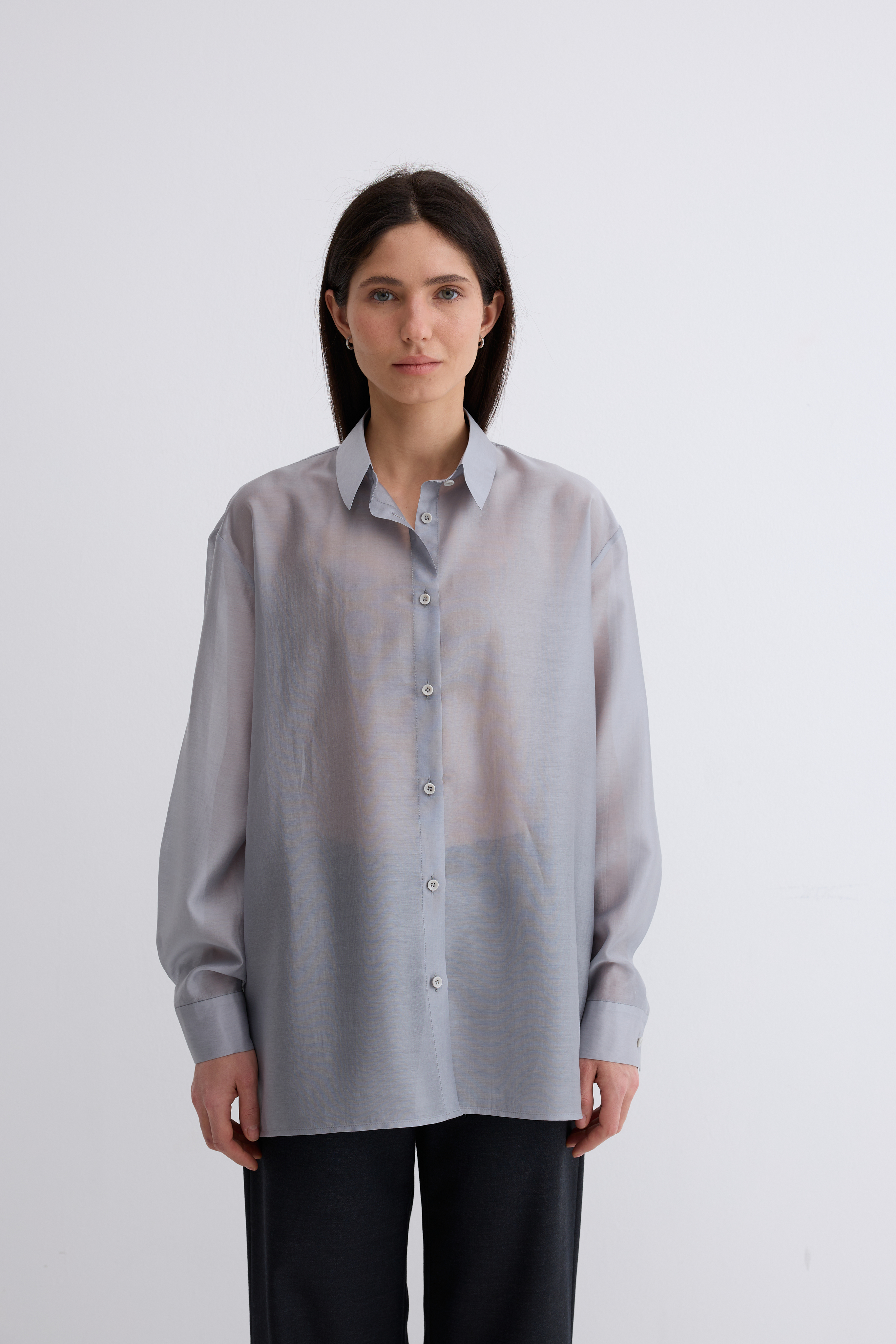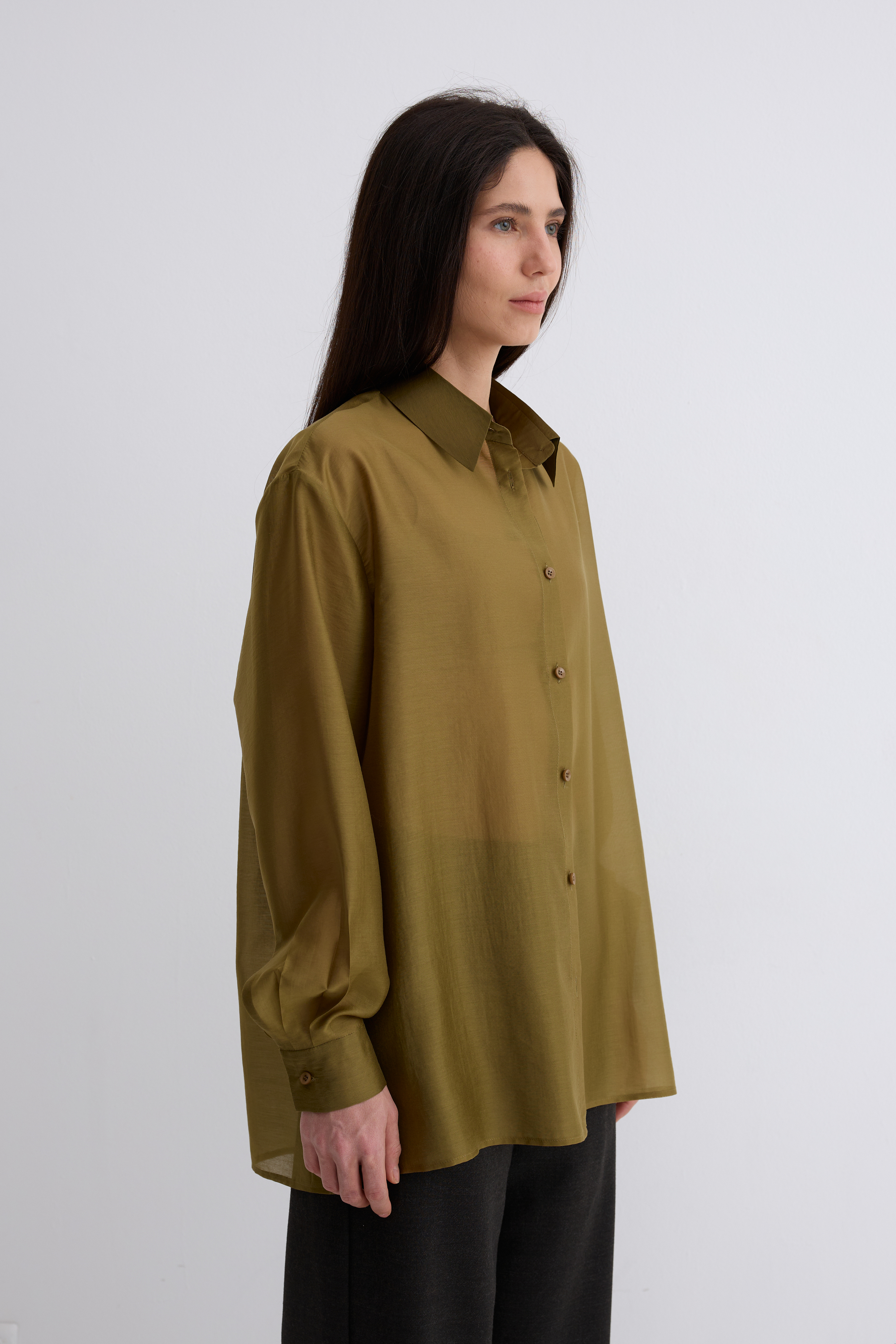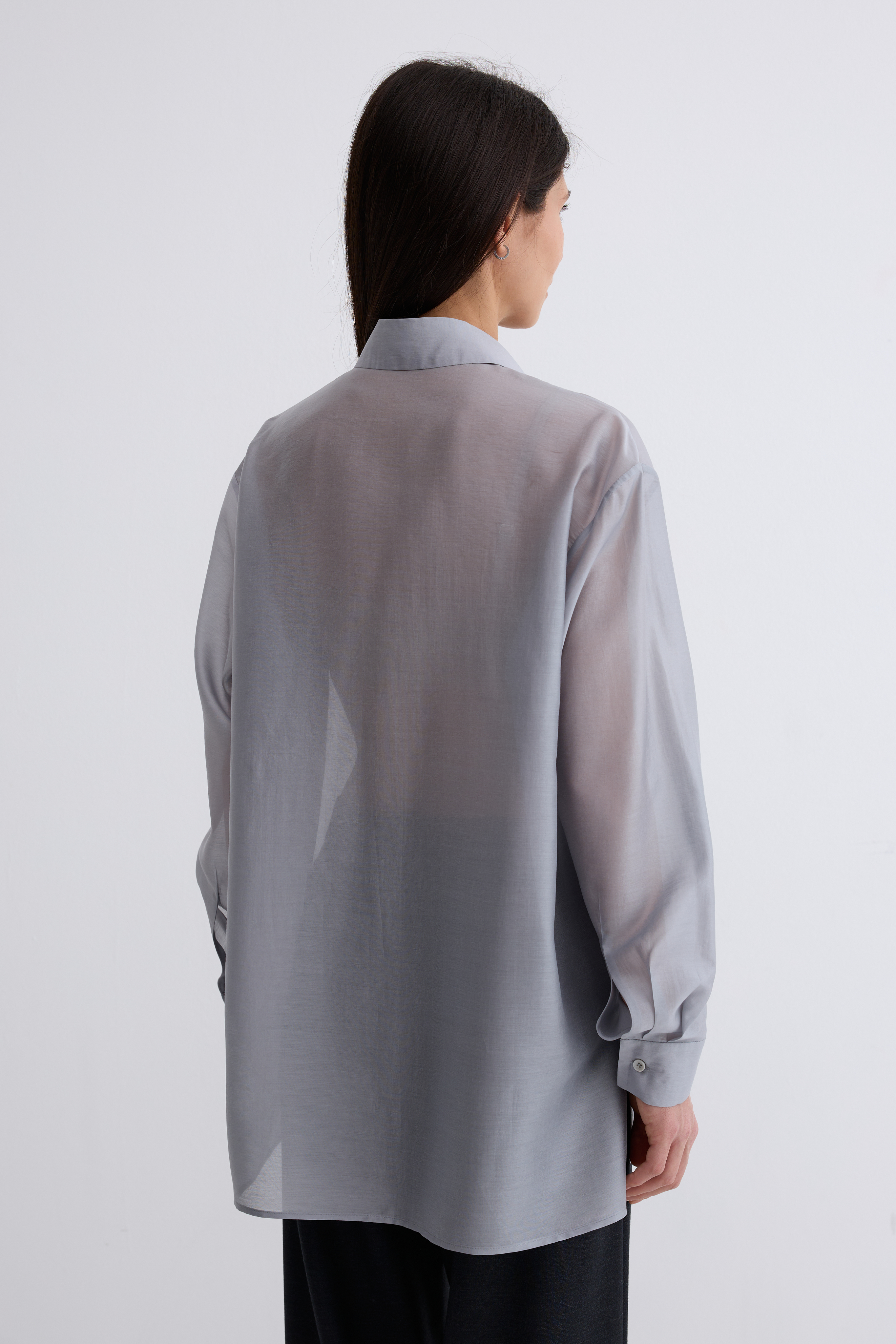 Рубашка Ветер. Классическая рубашка свободного кроя. Шелковистая, воздушная, при это ткань немного сухая, что создает форму, а не свивает. По бокам разрезы. Рубашка просвечивает. Размер единый.