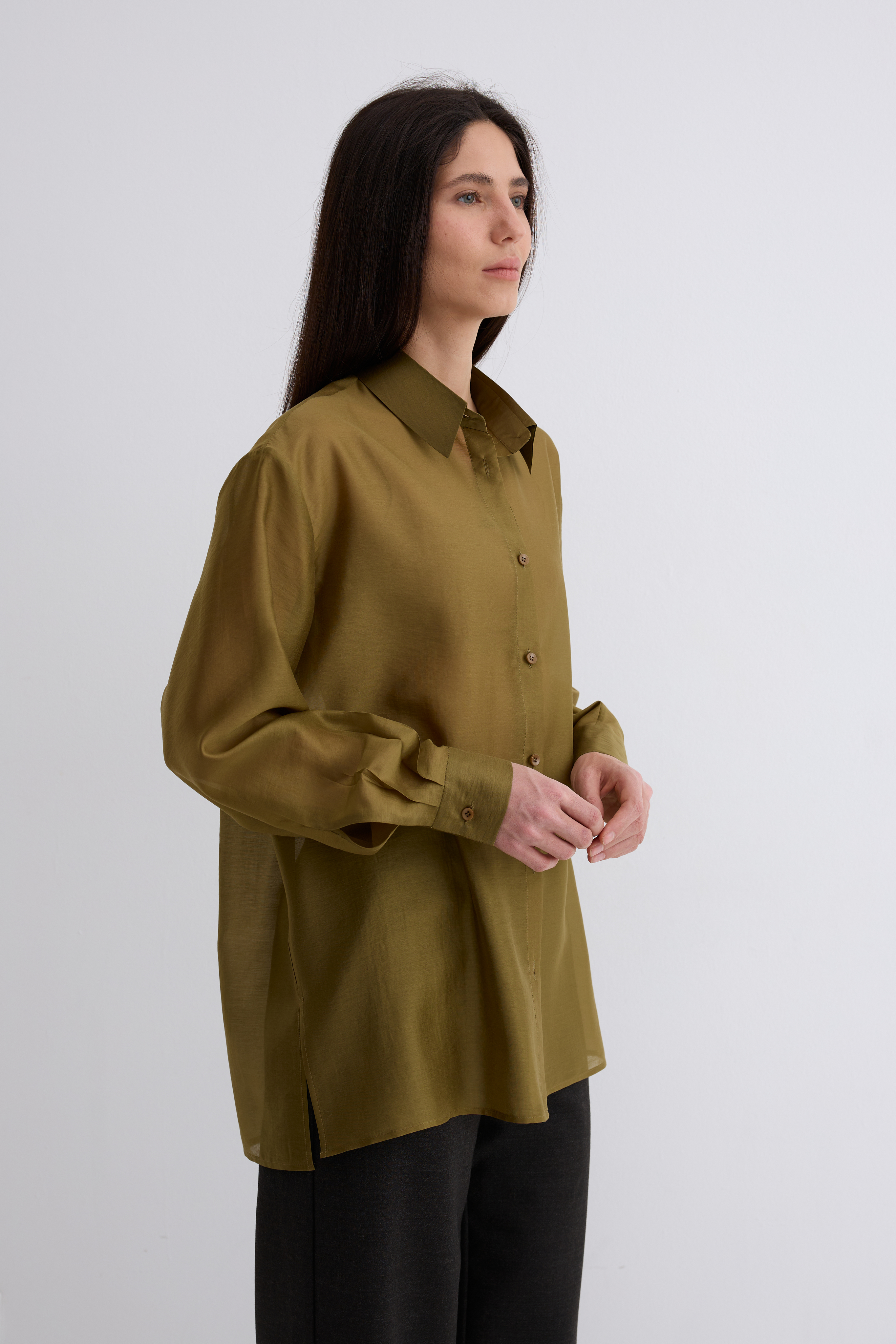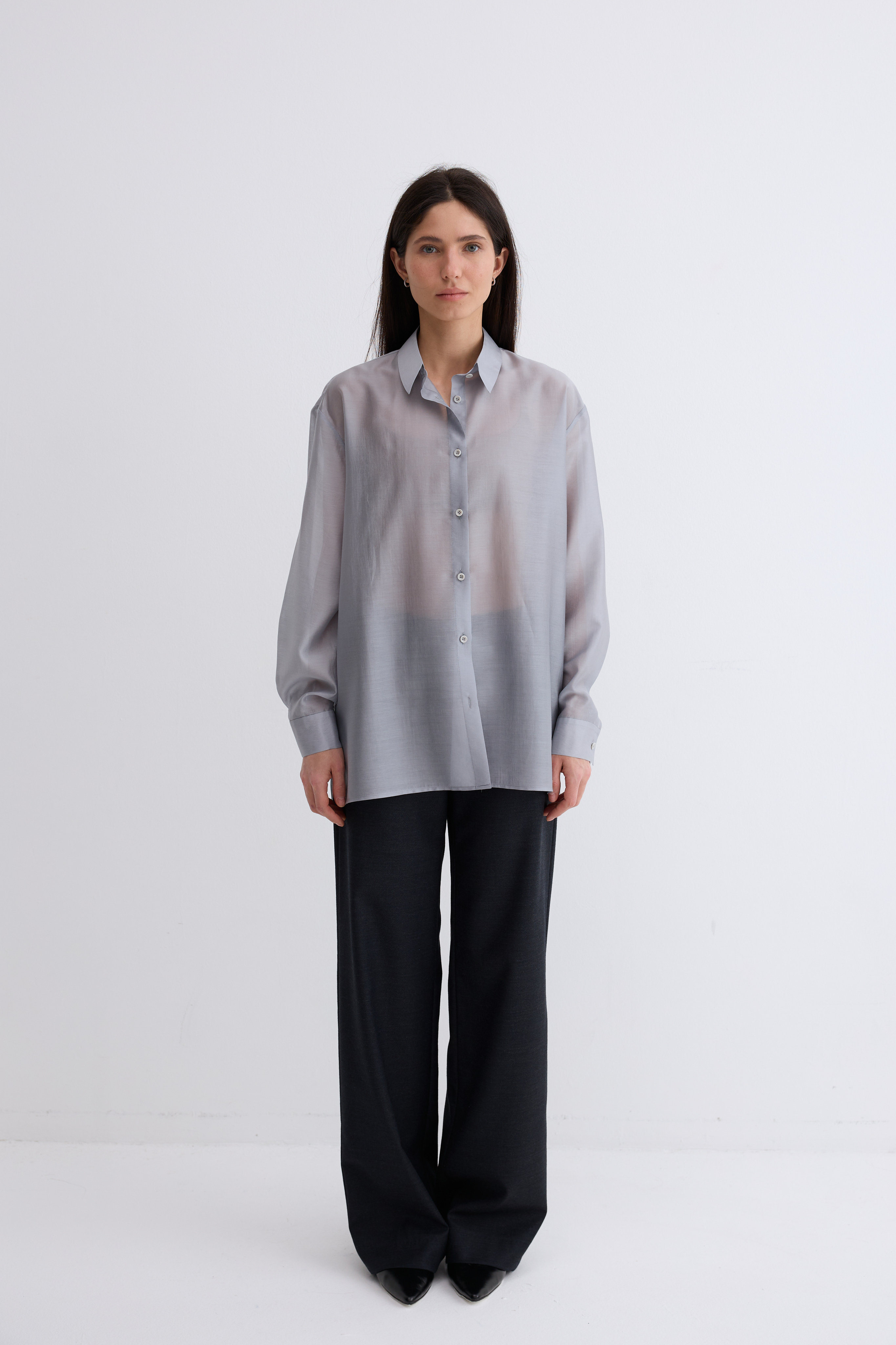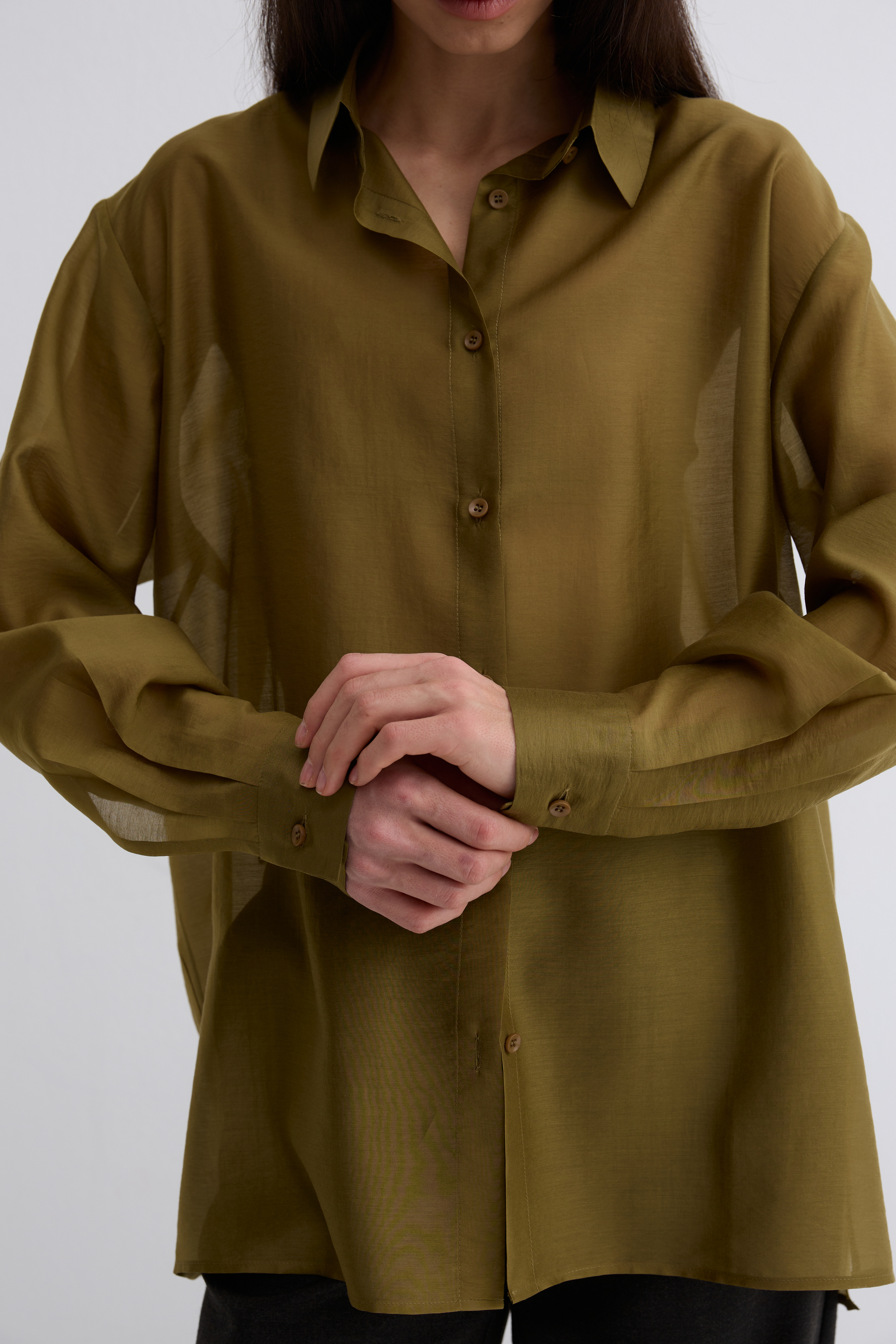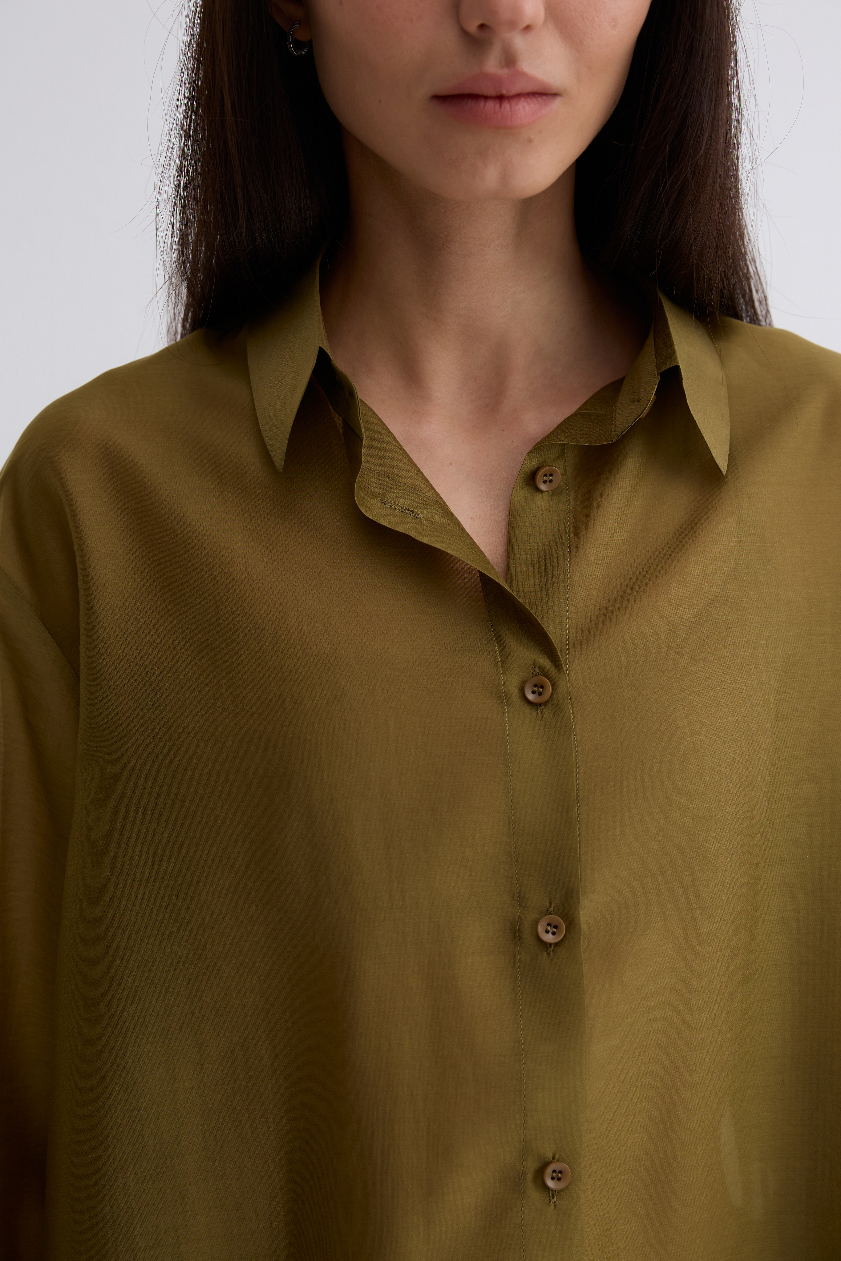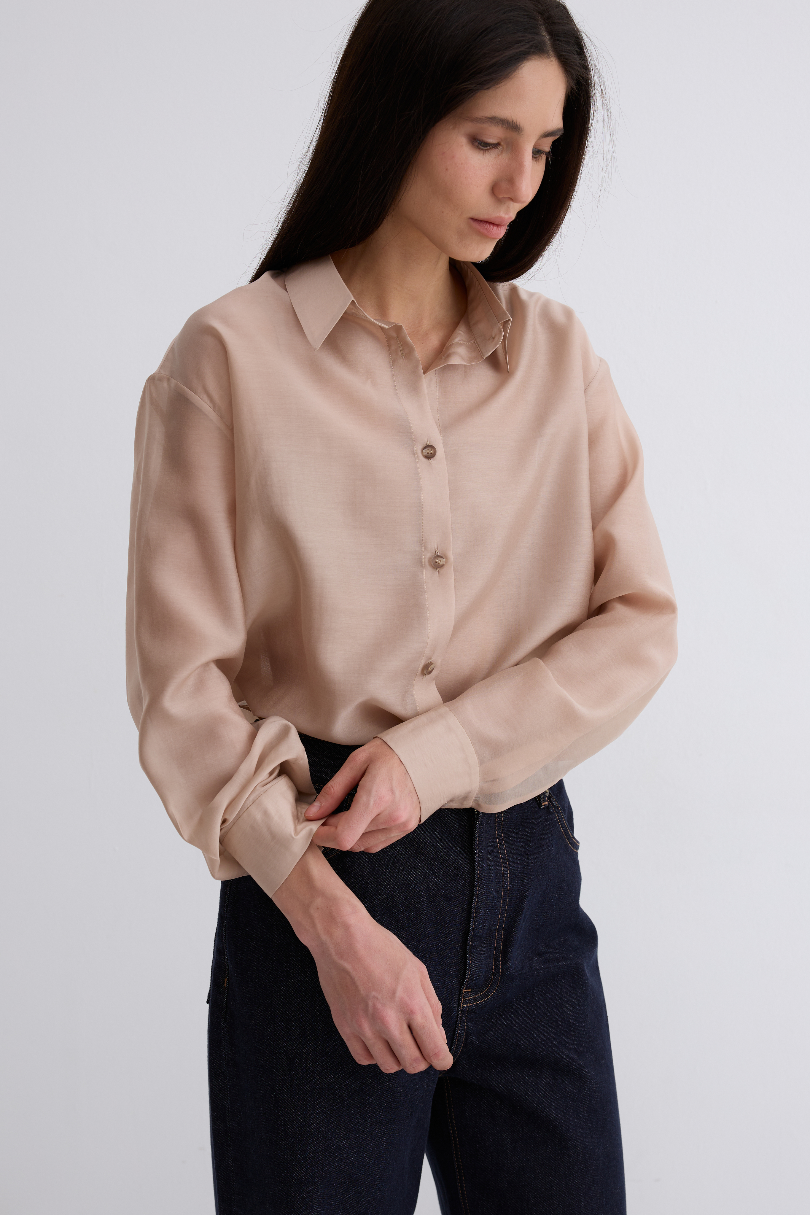 Рубашка Ветер. Классическая рубашка свободного кроя. Шелковистая, воздушная, при это ткань немного сухая, что создает форму, а не свивает. По бокам разрезы. Рубашка просвечивает. Размер единый.