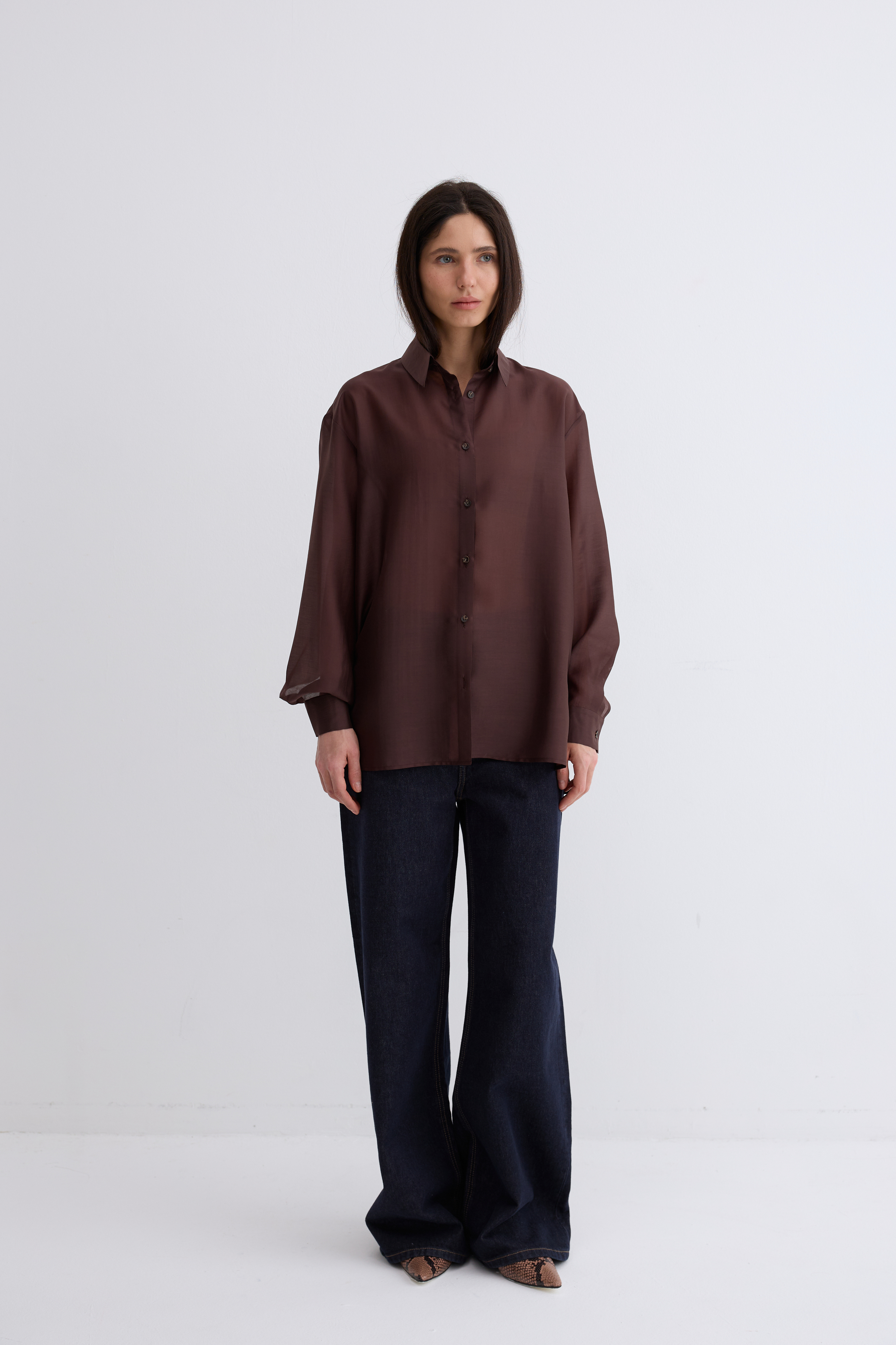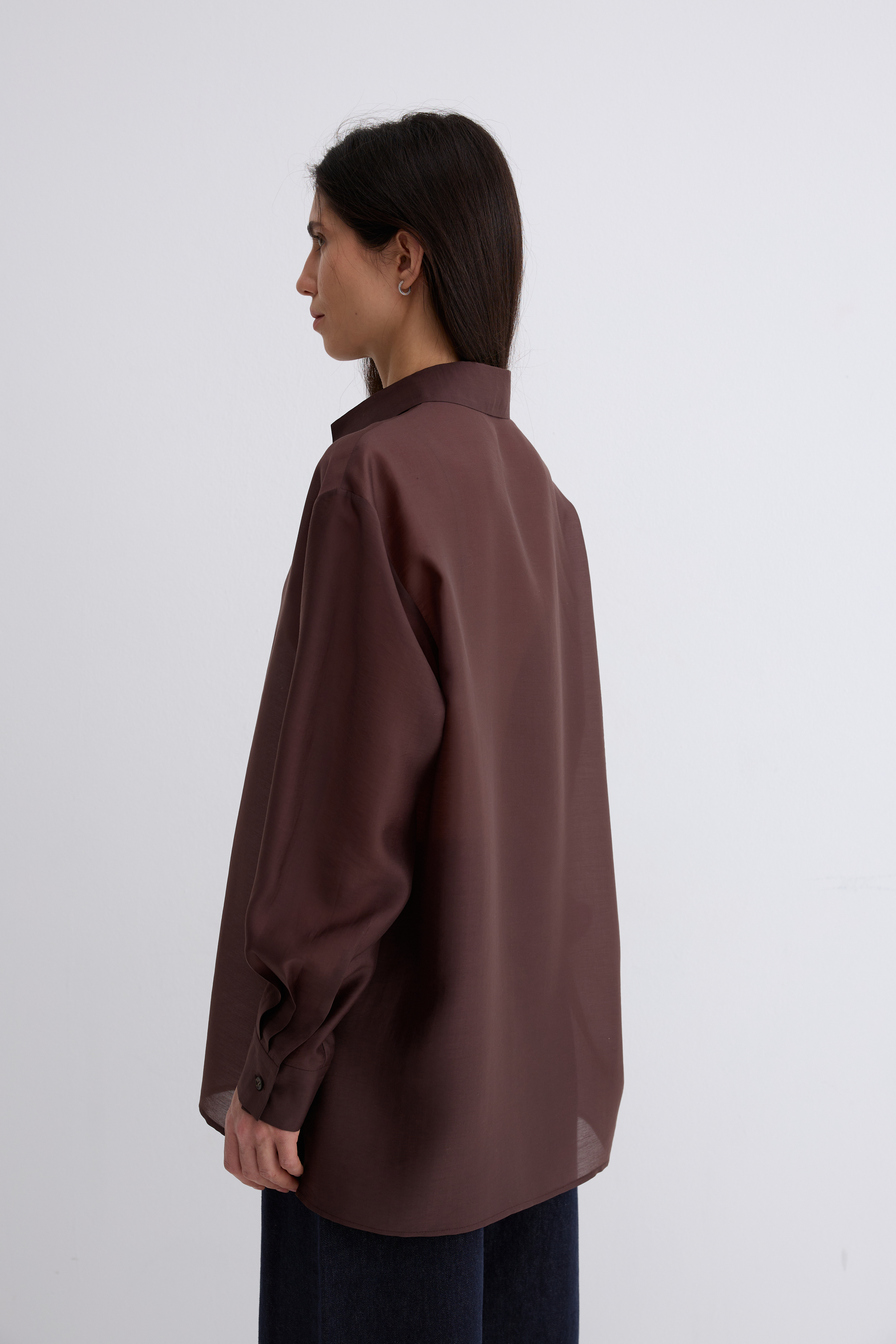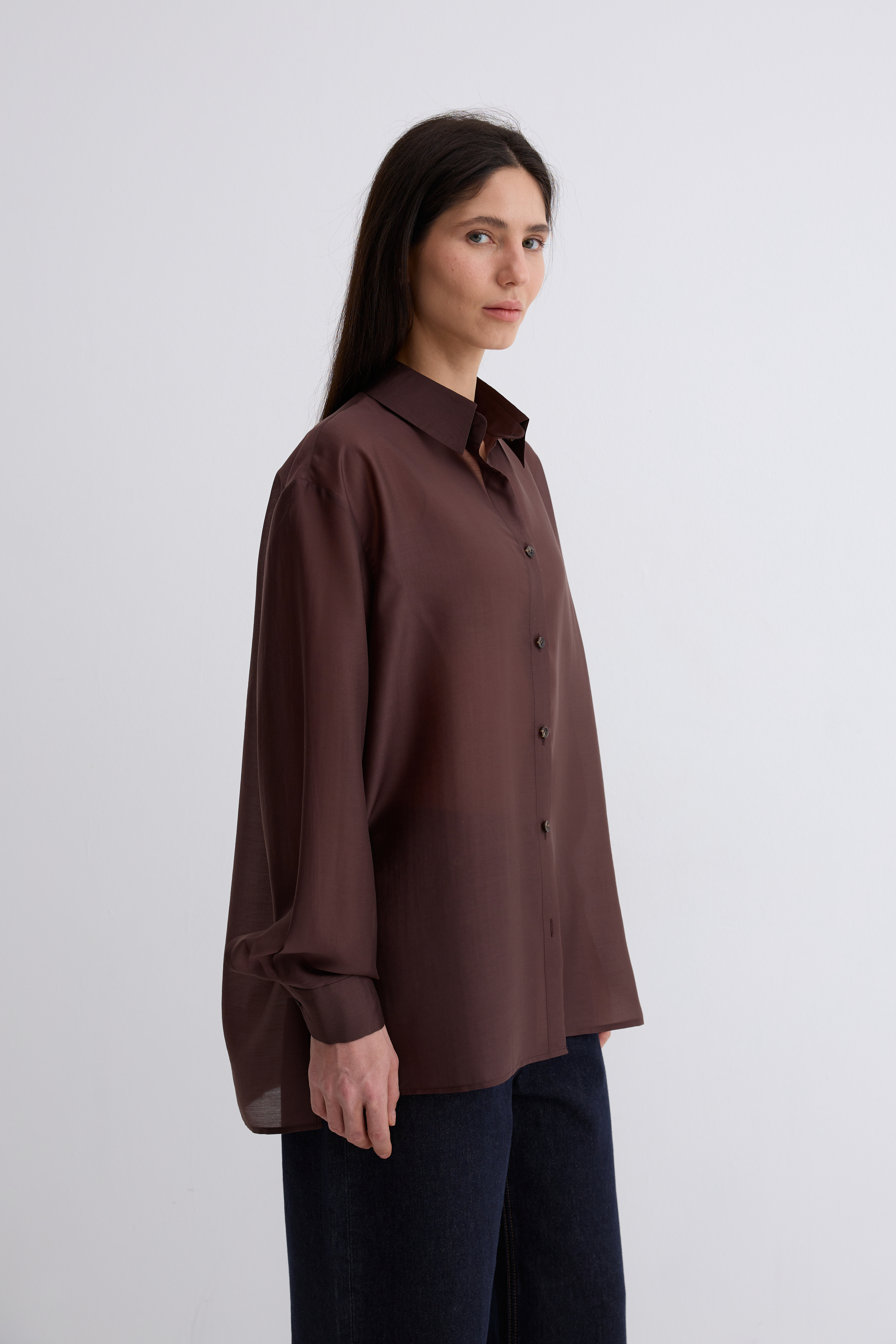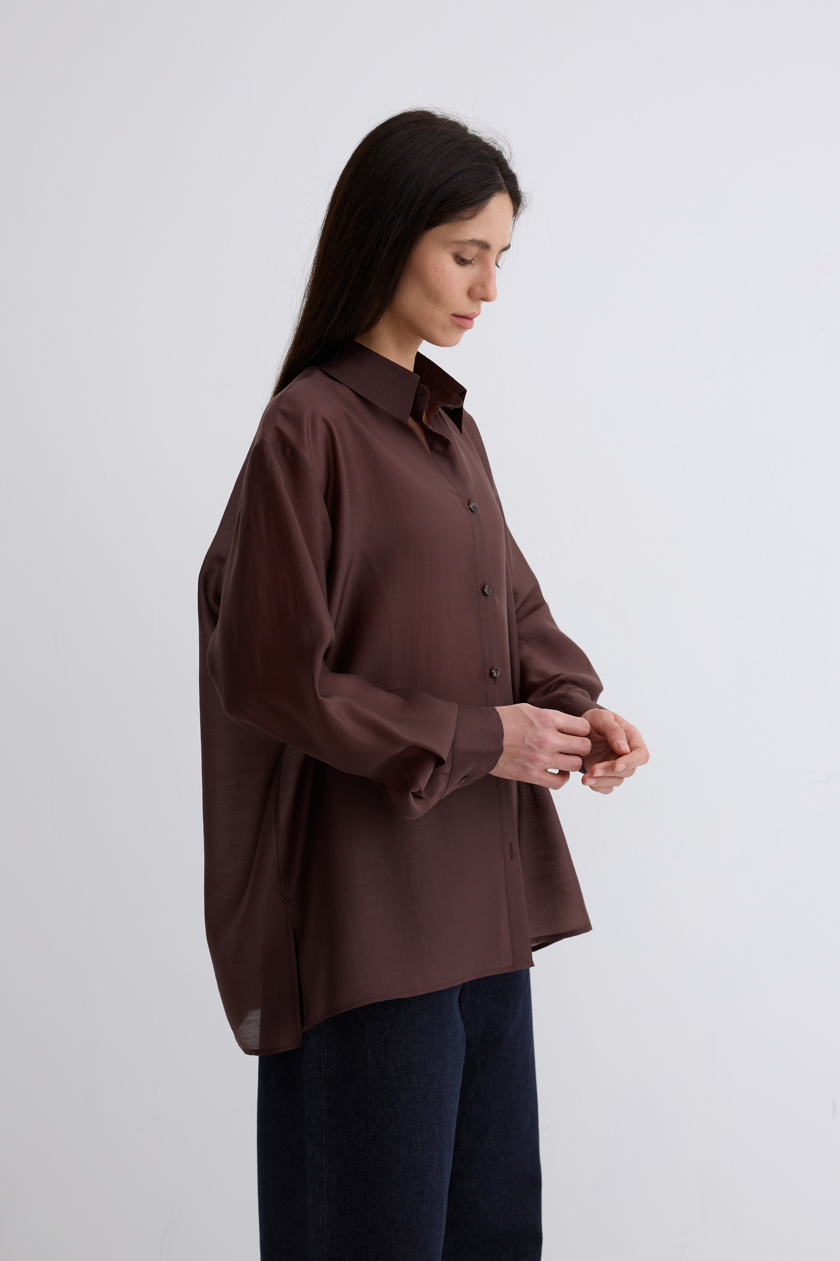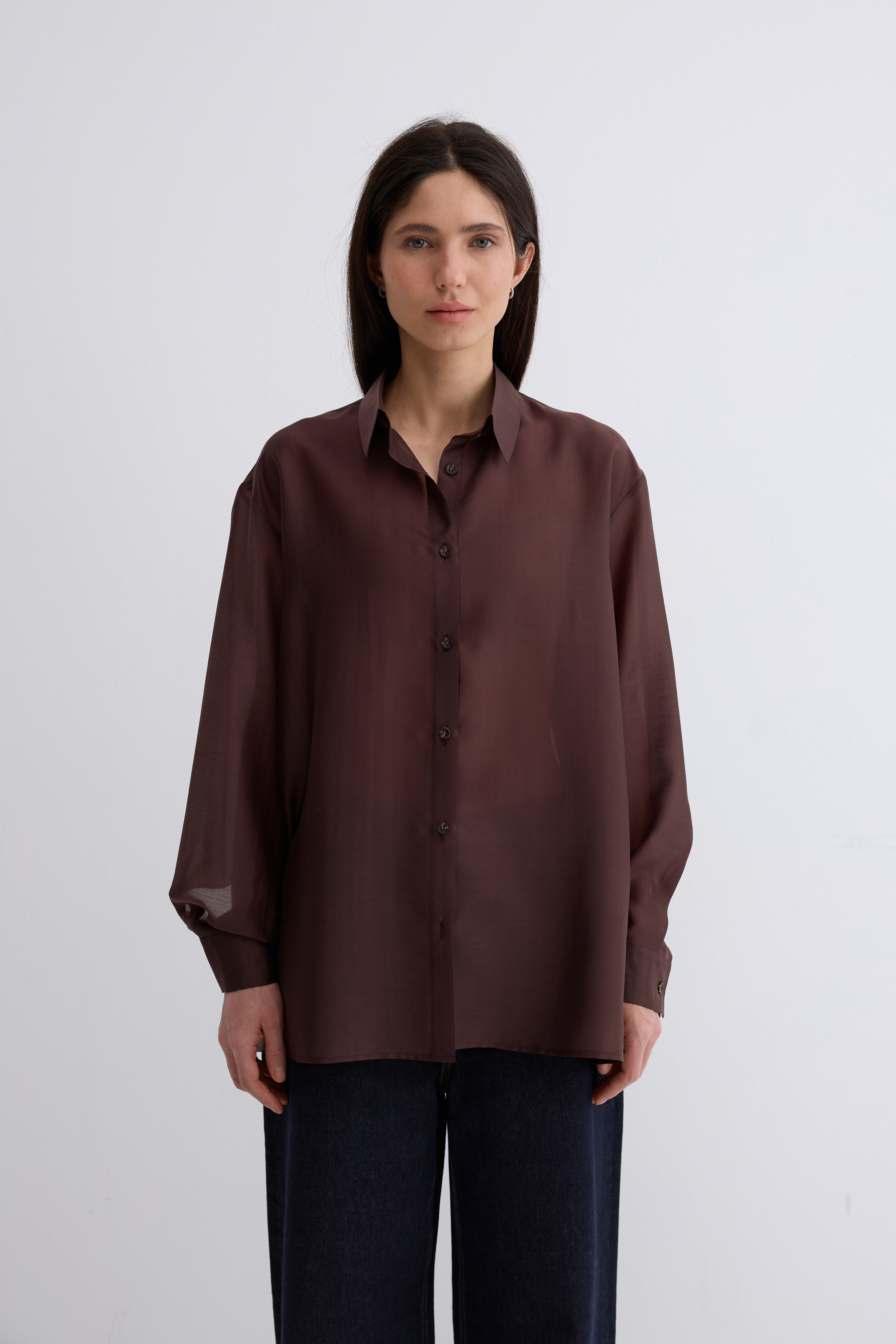 Рубашка Ветер. Классическая рубашка свободного кроя. Шелковистая, воздушная, при это ткань немного сухая, что создает форму, а не свивает. По бокам разрезы. Рубашка просвечивает. Размер единый.