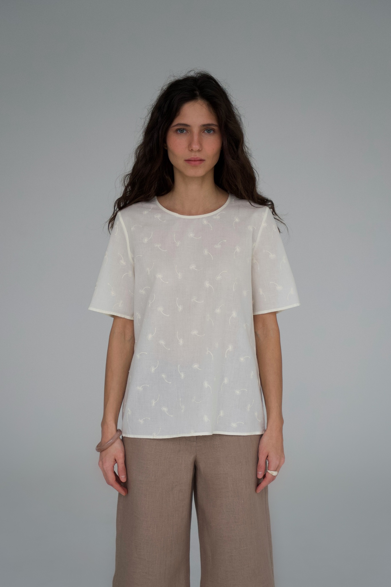 Топ из хлопка 100%. Ткань шитьё. Крой прямой, ворот без застёжки, рукав короткий.