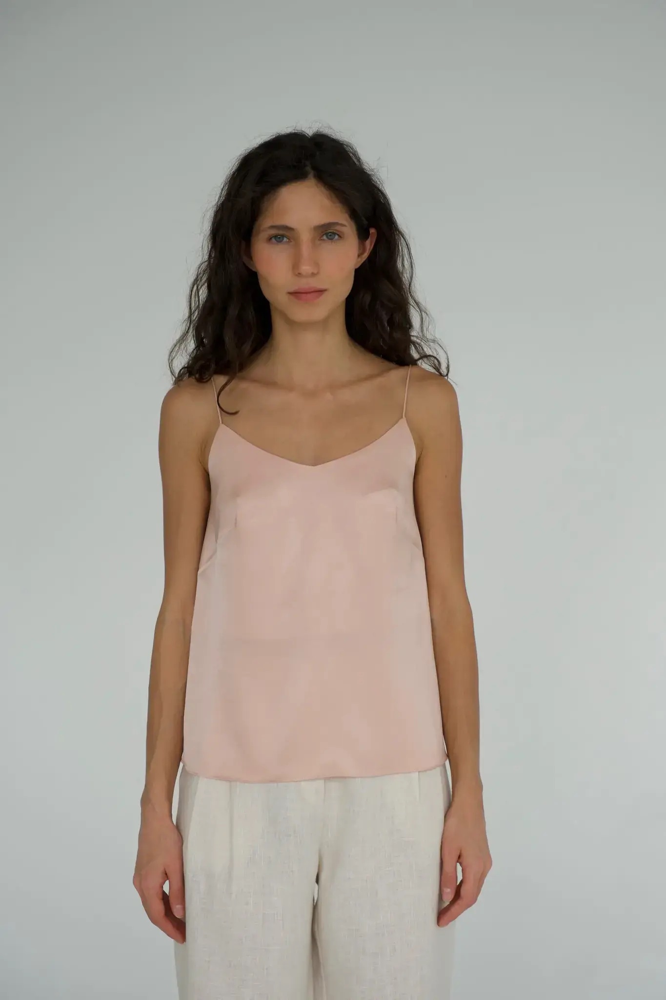 Топ Лили из вискозы и ацетата представлен в двух цветах и нескольких размерах. Ткань с деликатным блеском, очень пластичная, воздушная. Топ на тонких бретелях, красиво выглядит как навыпуск, так и заправленным. Не просвечивает, у топа двойной лиф.