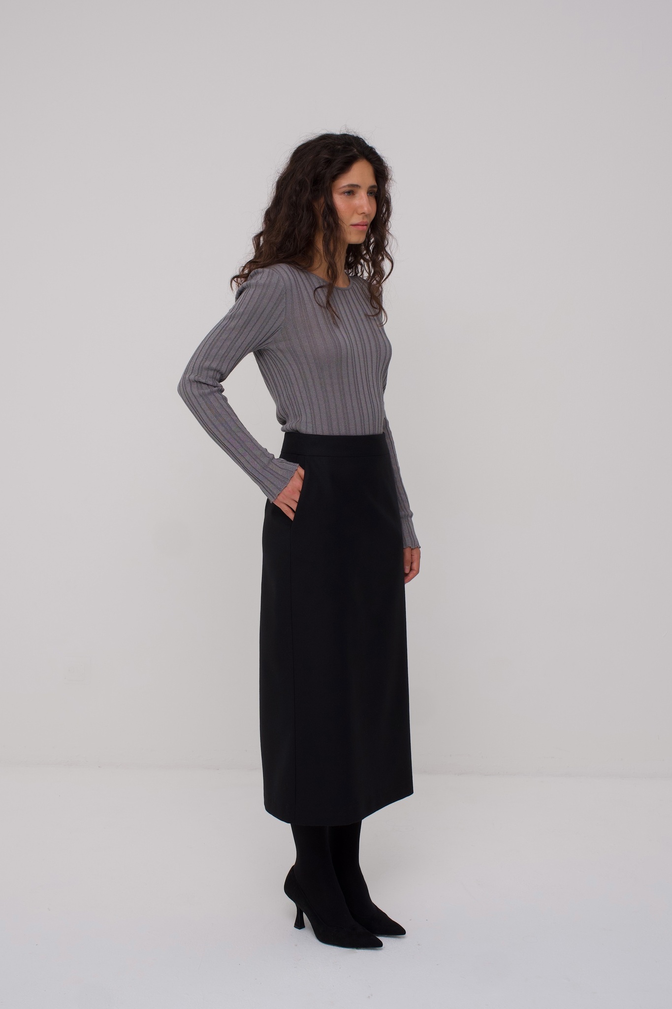 Юбка Астер прямая из шерсти 100% на подкладке из вискозы 100%. Юбка со шлицей сзади и двумя карманами по бокам. Шерсть приятная на ощупь, с деликатным ворсом.