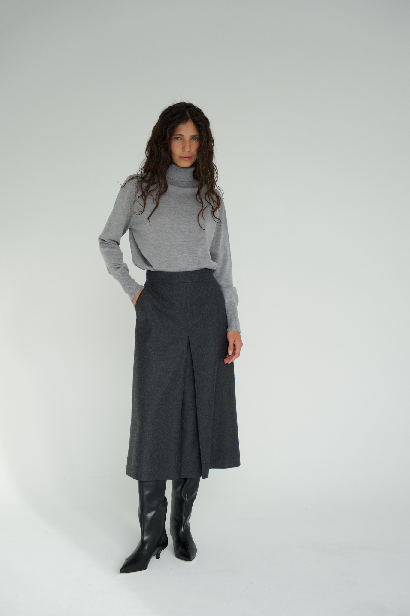 Юбка Gray из шерсти 100% на подкладке из вискозы 100% в сером цвете. Длина миди. Юбка с двумя карманами, на потайной молнии сзади, со встречной складкой. Размеры 42-50. Шерсть приятная на ощупь, с деликатным ворсом. Неплотная, но хорошо держит форму.